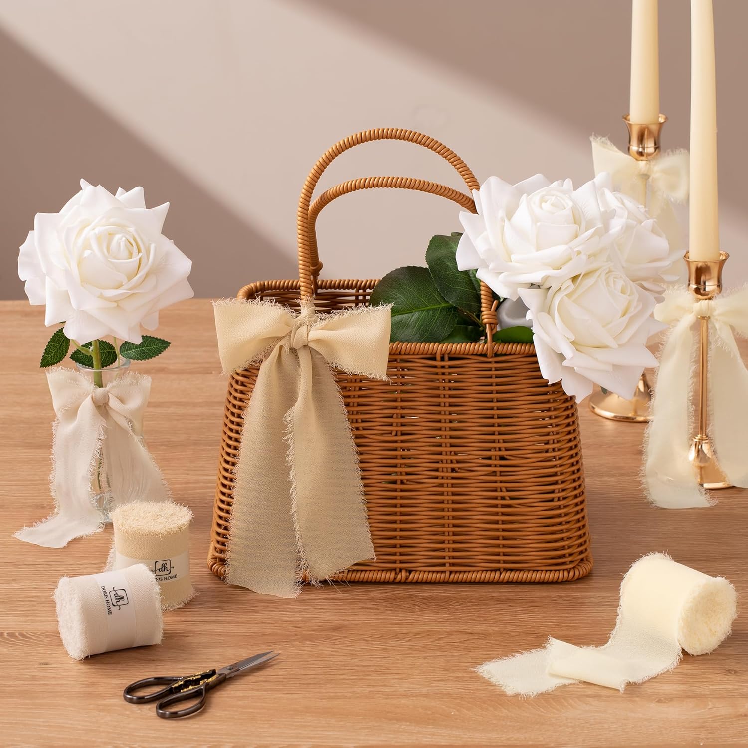 • 【High Quality】Made from premium chiffon fabric, it's soft, lightweight, and smooth, enhancing an elegant and delicate touch. The frayed edges give the ribbon a sheer, airy quality, stunning when sunlight shines through and gently sways in the breeze. This chiffon ribbon is ideal for use as wedding ribbon and flower bouquet ribbon.