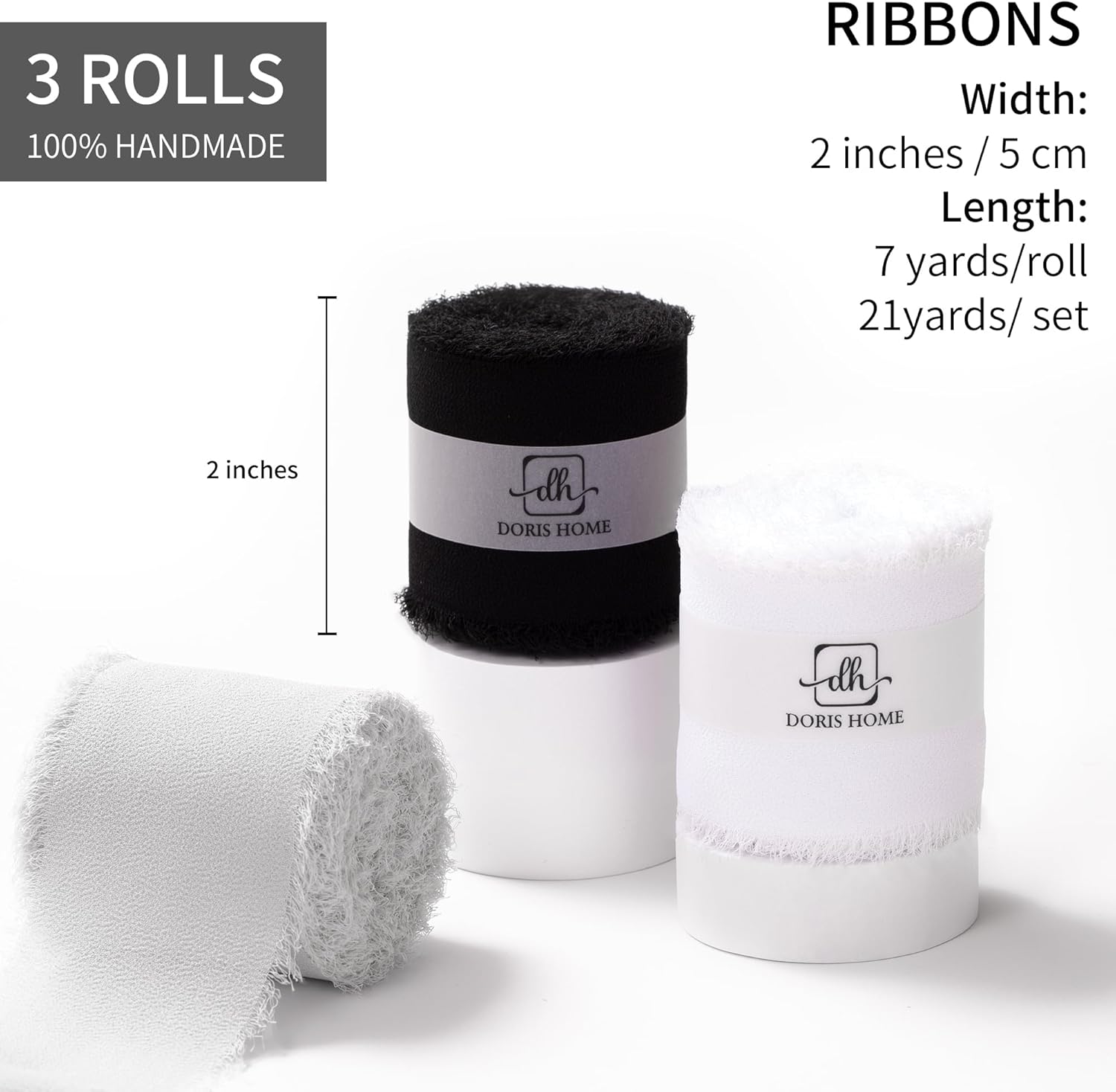 DORIS HOME 2" x21Yd Chiffon Ribbon for Flower Bouquet, Black & White Fabric Ribbon for Gift Wrapping, Handmade Frayed Ribbon for Wedding Christmas Decorations