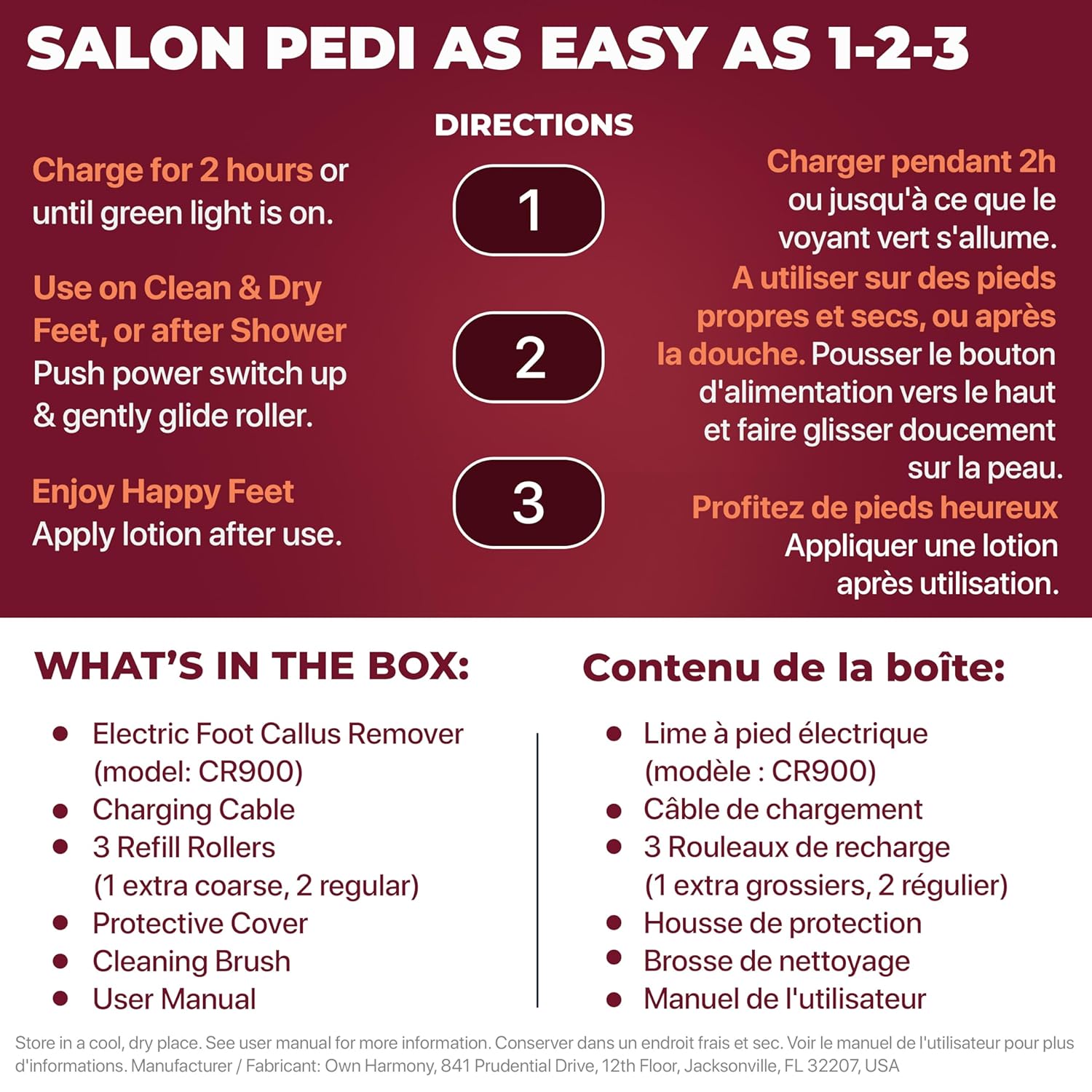 • HAPPY FEET TIPS: Charge for 2 hours; Use on clean and dry feet, or after shower; Gently glide roller on heels, toes and soles of feet – do not apply pressure; Use extra coarse roller for heavy callus build-up; Use regular coarse roller to maintain smooth & soft feet