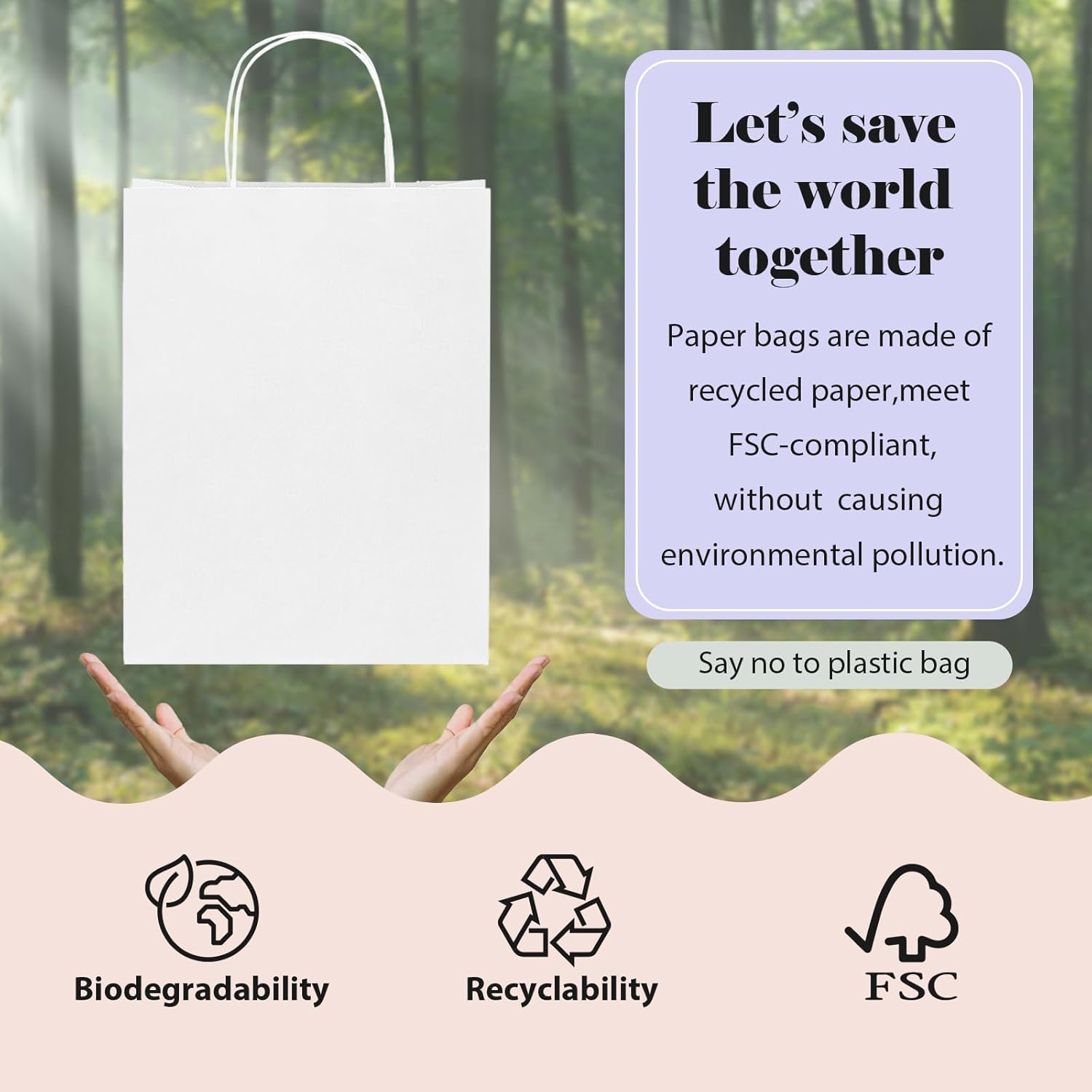 • RECYCLABLE - Halulu kraft paper white bags are made of premium recyclable kraft paper. They are durable, and reusable. Great for giving gifts or retail use. Great for packing groceries, merchandise, or takeout meals. These kraft paper bags are not waterproof and do not have pe film coating. Our kraft paper bags are recyclable, compostable, and a great alternative to plastic bags.