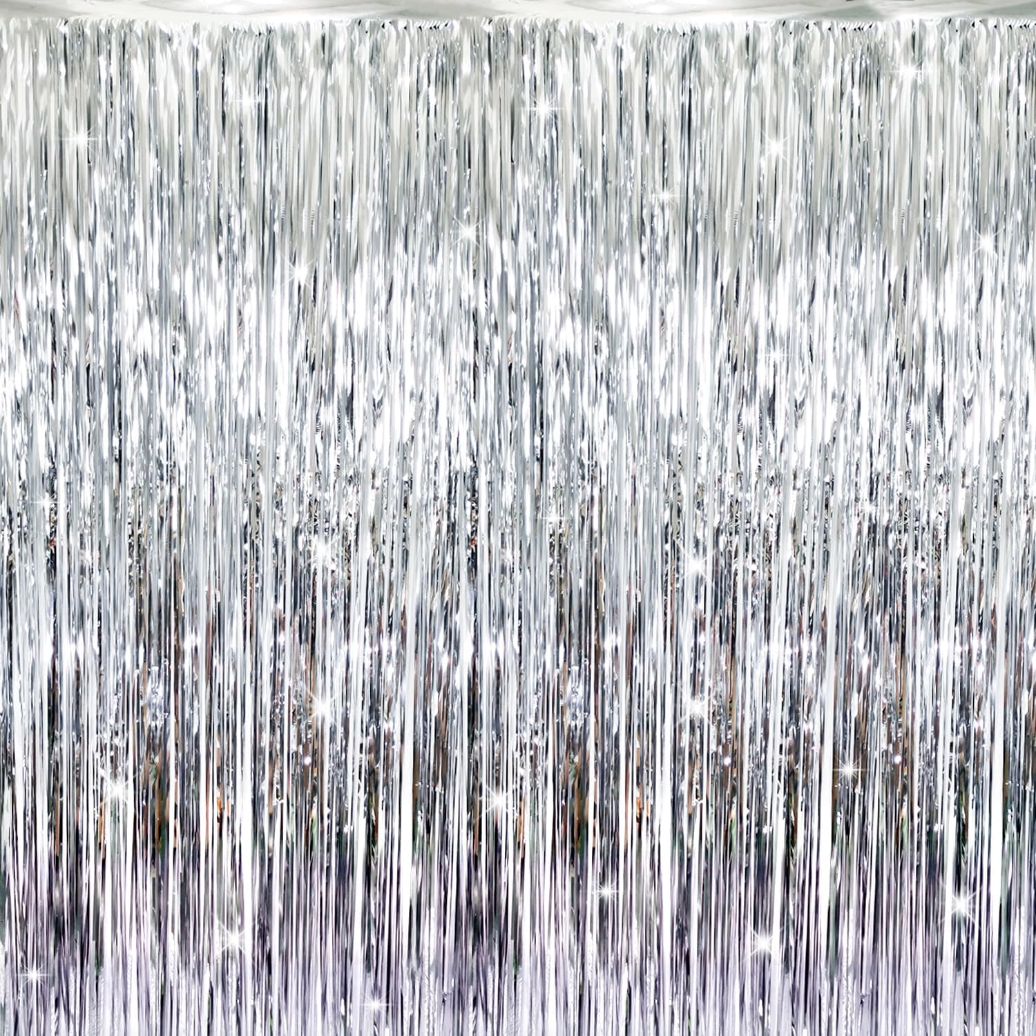 GOER 3.2 ft x 9.8 ft Metallic Tinsel Foil Fringe Curtains Party Photo Backdrop Party Streamers for Birthday,Graduation,New Year Eve Decorations Wedding Decor (Silver,1 Pack)