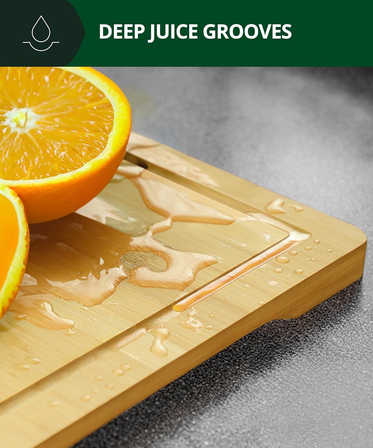 • PRACTICAL DESIGN: Built with thoughtful craftsmanship, our bamboo board is designed for easy meal prep. At 18”x12”, it provides plenty of space for ingredients, while side handles make it easy to move. The juice groove prevents liquids from spilling, keeping your countertops clean. To wash, just use mild soap and warm water to hand wash this versatile board.