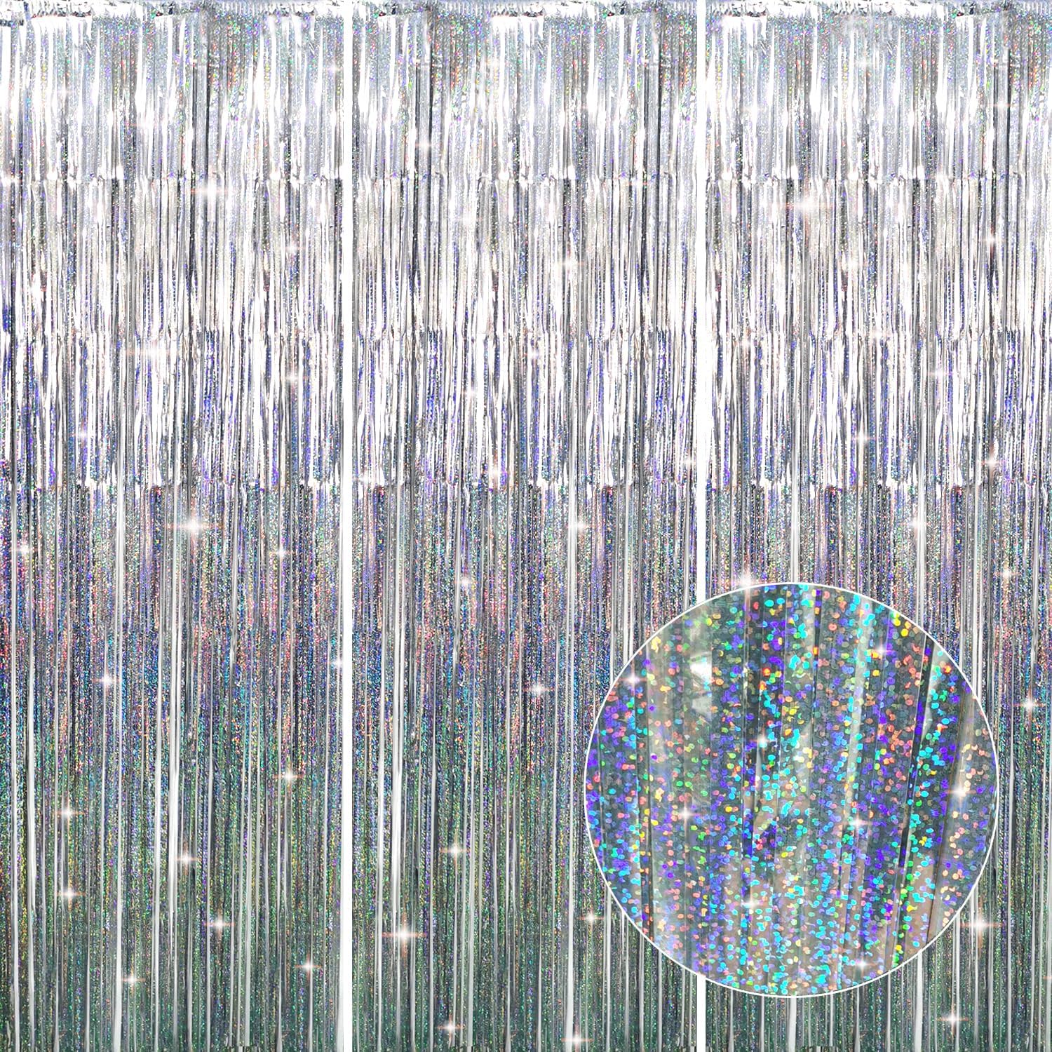 • Package Includes:3 pack shiny silver foil fringe curtains,3.2 ft x 8.2 ft each,suitable for hanging on a door or coverage a wall fully