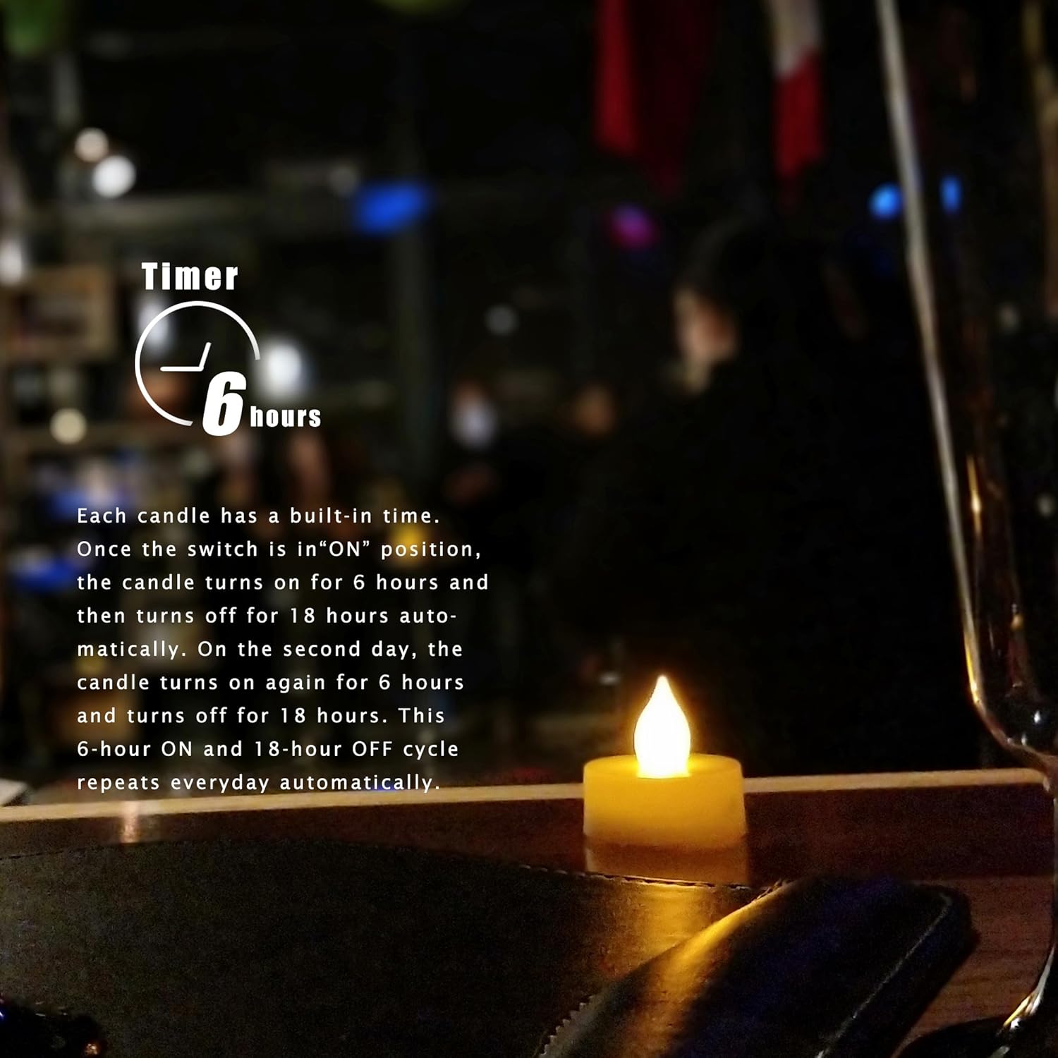 • 6-hour daily cycle timer. Once the LED votive candles / tea lights are turned on, they stay on for 6 hours and then turn off automatically for the next 18 hours. The auto timer function saves the trouble of turning on and off these flameless tea lights manually every day.