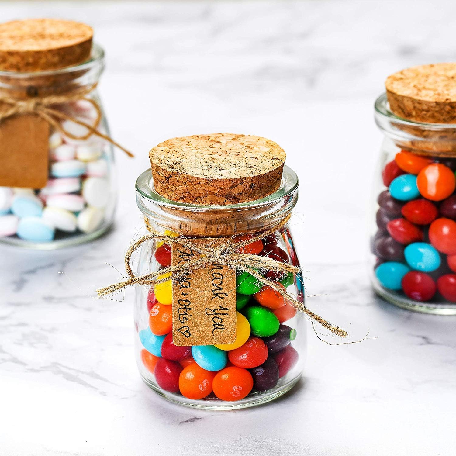 • ADDED LABELS - Perfect for gift bags and party favors, these little glass jars come with 20 brown paper labels and a bundle of twine to add a personalized touch to every bottle!