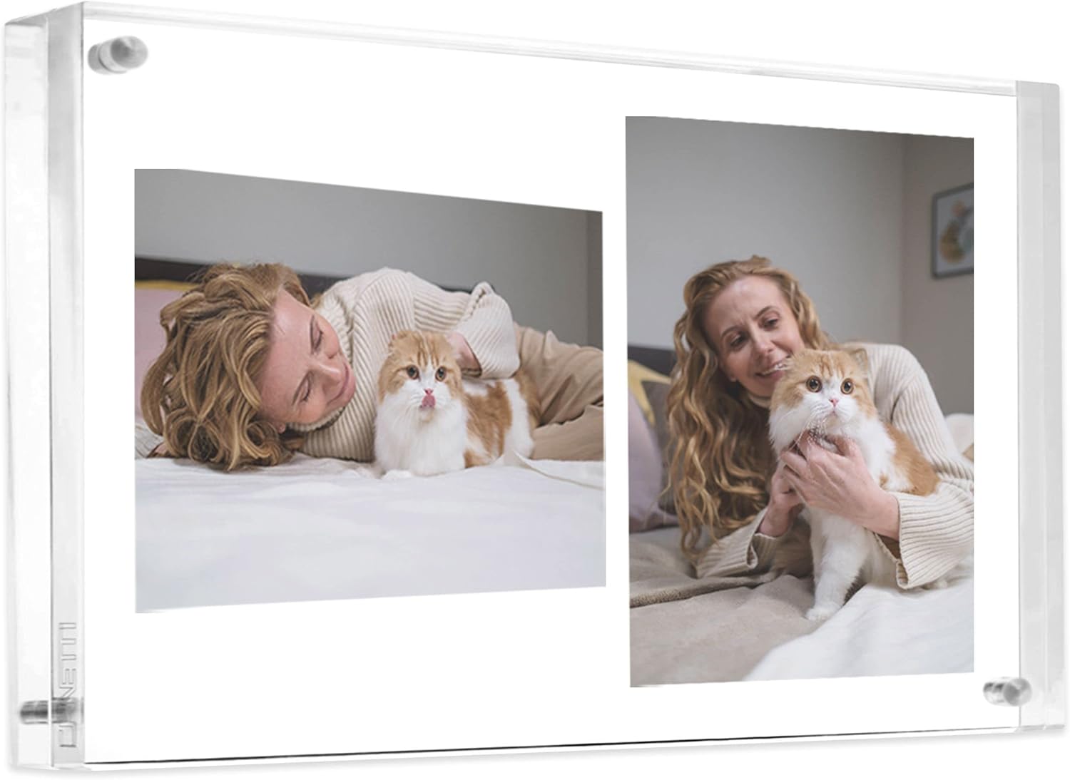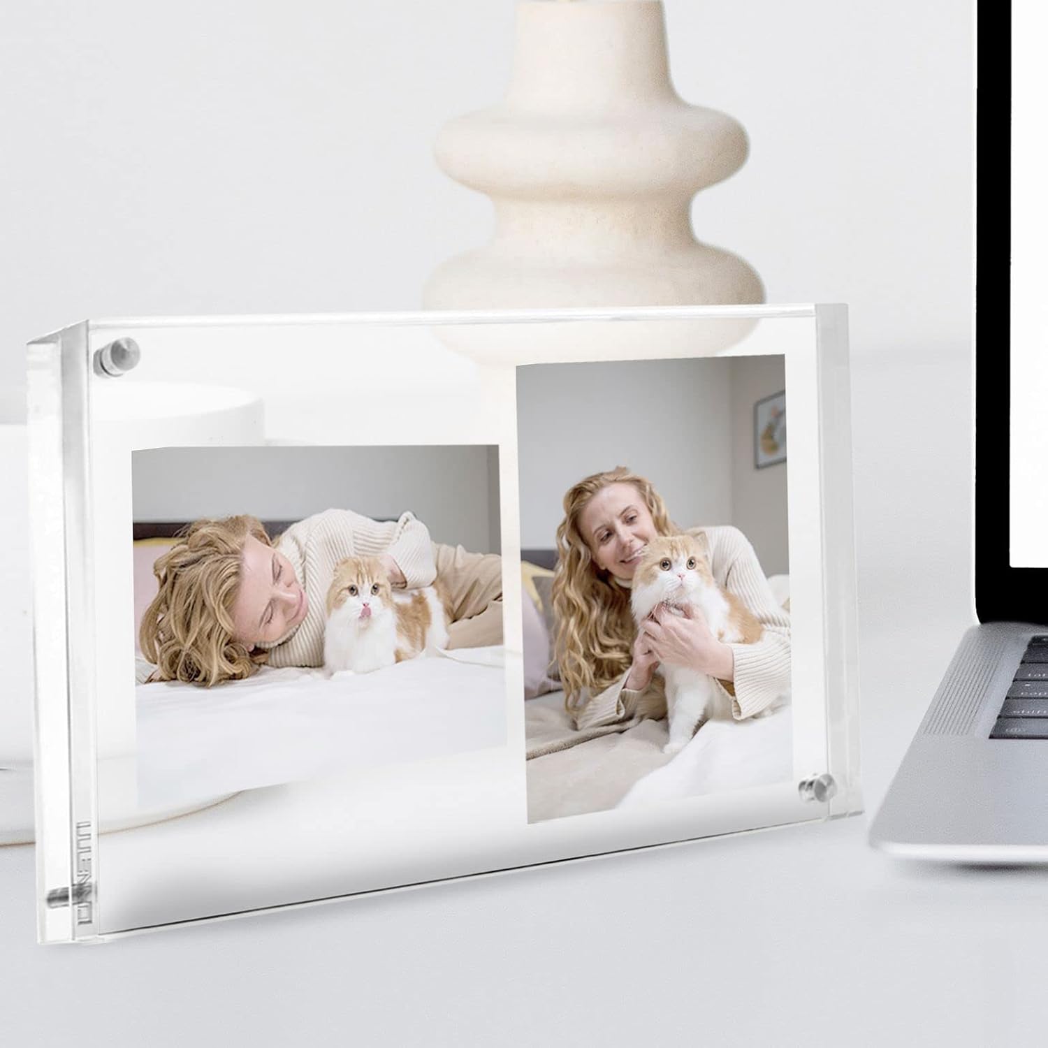 • UNIQUE DESIGN - This magnet frame has a frameless design with two thick solid acrylic panel, held together by tiny magnet points. It's easy to place and secure your pictures between the panels.