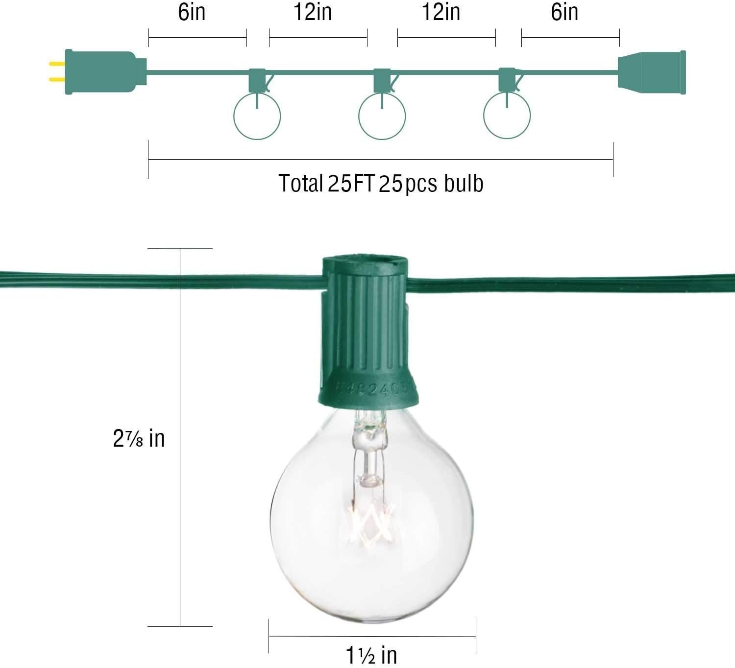 • G40 globe string lights are made of 25 feet long string used to connect 25 clear G40 Bulbs. 6” lead with male plug, 12” spacing between bulbs, 6” tail with female connector. Each strand has end to end connections, so that you will easily be able to attach up to 3 strands to cover large areas. Even with broken or removed bulbs, remaining bulbs will continue to light up