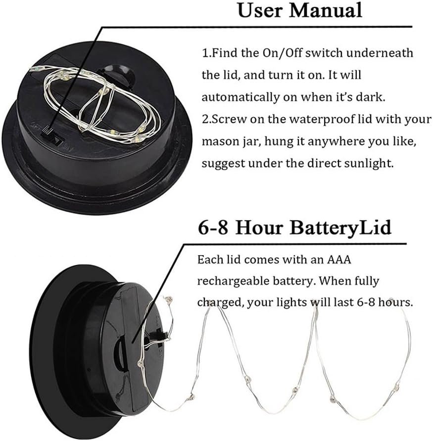 • Solar Powered Mason Jar Lid Lights. - Energy Saving & Environment Friendly. 100% solar powered solar panel, no requires external wiring. 1.2v/600mAH AAA rechargeable battery included. It need take 6-8 hours charging time by fine sun light, light up for about 8-12+hours.