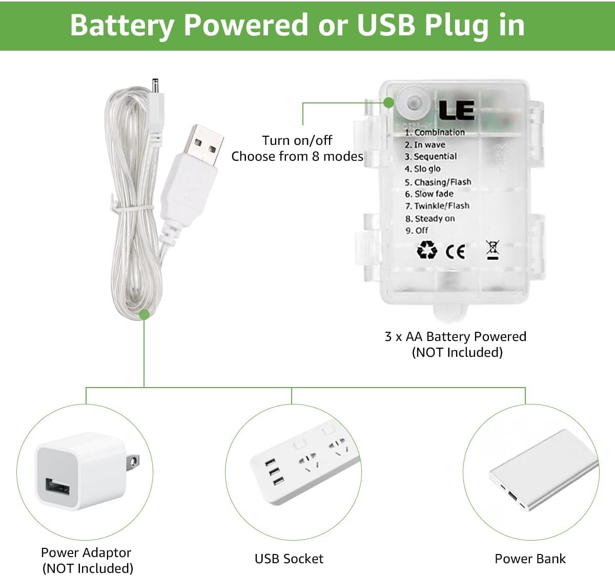 • USB Powered. Hook up the USB plug to a power bank. You can also plug in these curtain twinkle lights in a USB port hub outlet or use a regular USB phone charger base (not included)
