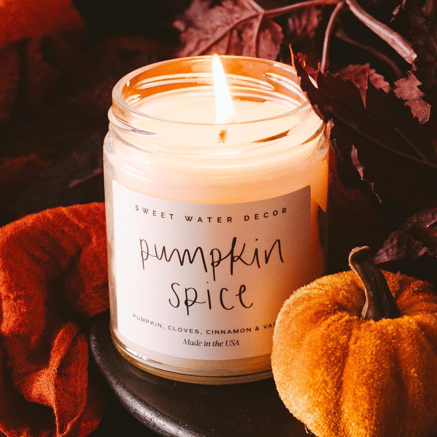 Sweet Water Decor Pumpkin Spice Candle - Fall Candles with Pumpkin, Clover, Cinnamon & Vanilla Scent for Home - Autumn Candle with 40 Hours Burn Time - 9Oz Gold Lid Clear Jar Cozy Soy Candles