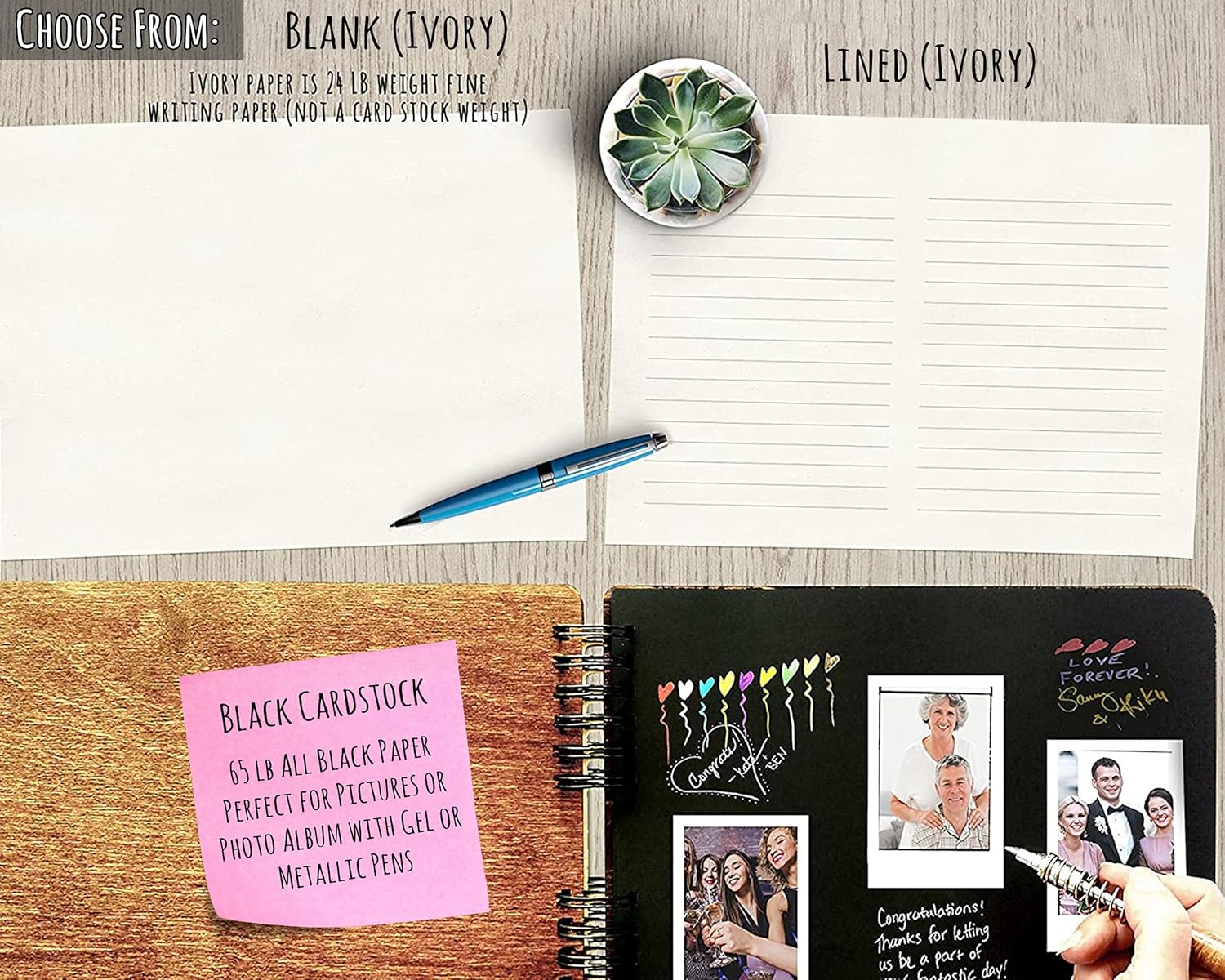 • 40 Inside pages in Ivory 24 Lb writing paper ( lined or blank pages ) or ALL BLACK CARDSTOCK pages perfect for instant photo photo booth guest book or a combination of Guest Registry and Wish cards and photo memory book, Wedding guests can just sign the guest book pages or add and free form their advice for the newlyweds. They will have fun taking pictures as well. Each page can easily accomodate 4 or more guest entries.