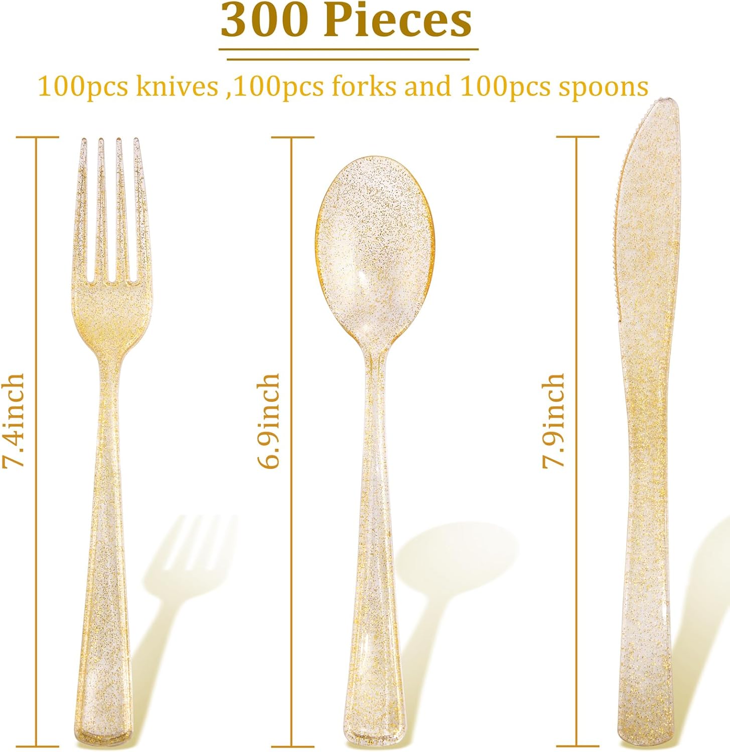 Supernal 300pcs Gold Glitter Plastic Cutlery Disposable Utensils Gold Plastic Silverware Sets Include 100 Forks, 100 Spoons & 100 Knives Serves for 100 Guests Suitable for Party,Thanksgiving