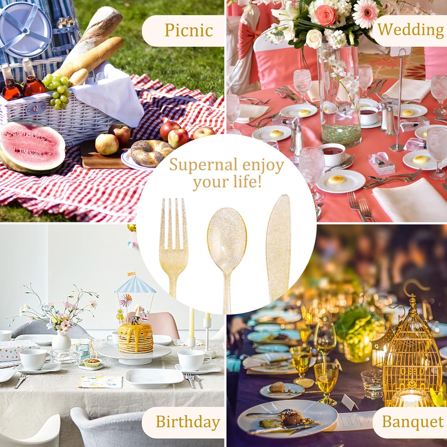 • Super Packed: Gold plastic silverware include 100pcs gold plastic forks (7.4"), 100pcs gold plastic spoons(6.9"), 100pcs gold plastic knives(7.87"), which are packaged together in a beautiful gift box. Elevate your events use our gold glitter plastic cutlery set, designed to mimic high-end metallic dinnerware while remaining lightweight and practical.