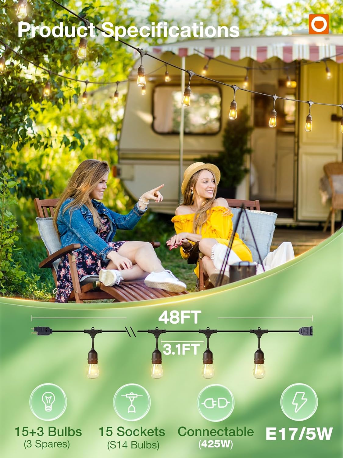 • [Including 1JCD-DL/E178 Edison Bulbs] Each strand contains 15 hanging sockets, provided with 18pcs 5W S14 incandescent glass bulbs. Compare it to the LED plastic bulbs, which is heavier but at the same time more translucent and heavy duty. The distance between bulbs is approximately 3.11FT. The maximum serial-connected power is 425W