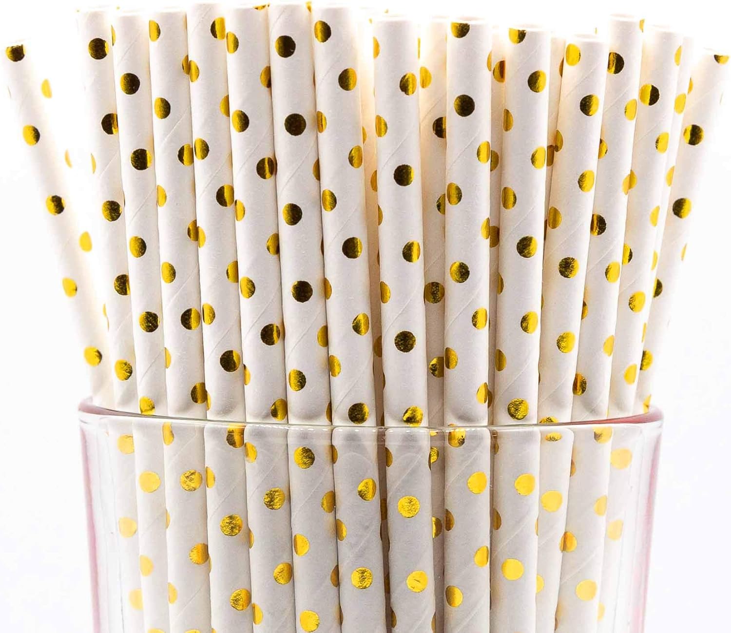 Pack of 150 Gold Polka Dot Foil Biodegradable 4-Ply Paper Drinking Straws (Compostable, Non-toxic, BPA-free)
