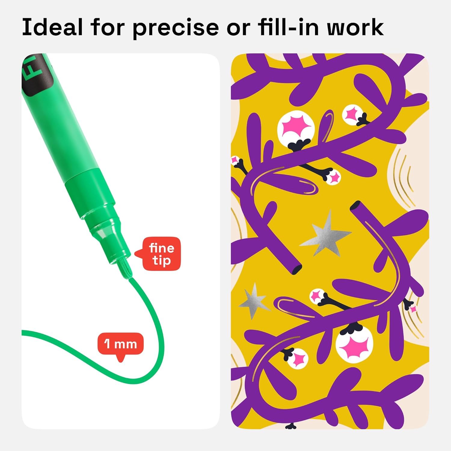 • Professional Quality: Artistro oil based paint markers flow without flooding or jamming with a fine round tip 1-2mm. These paint pens have a Japanese nib and Italian oil based paint in: black, white, gold, silver, brown, blue, yellow, orange, red, green, pink, purple, bright blue, hot pink, and glowing green.