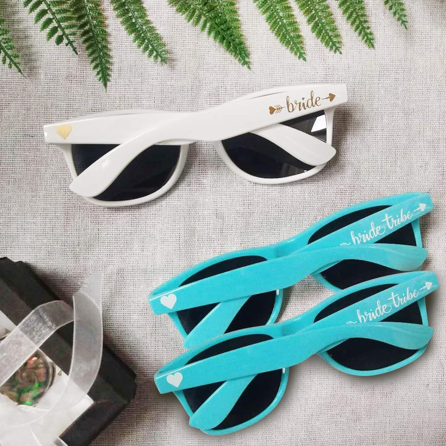 • Bachelorette Sunglasses Set---This Bachelorette Sunglasses kit contains a total of 1 Pair of white 'Bride' Sunglasses, 9 Pairs Blue 'Brides tribe' Sunglasses for bridesmaid. Great idea for Bachelorette party and bridal party.