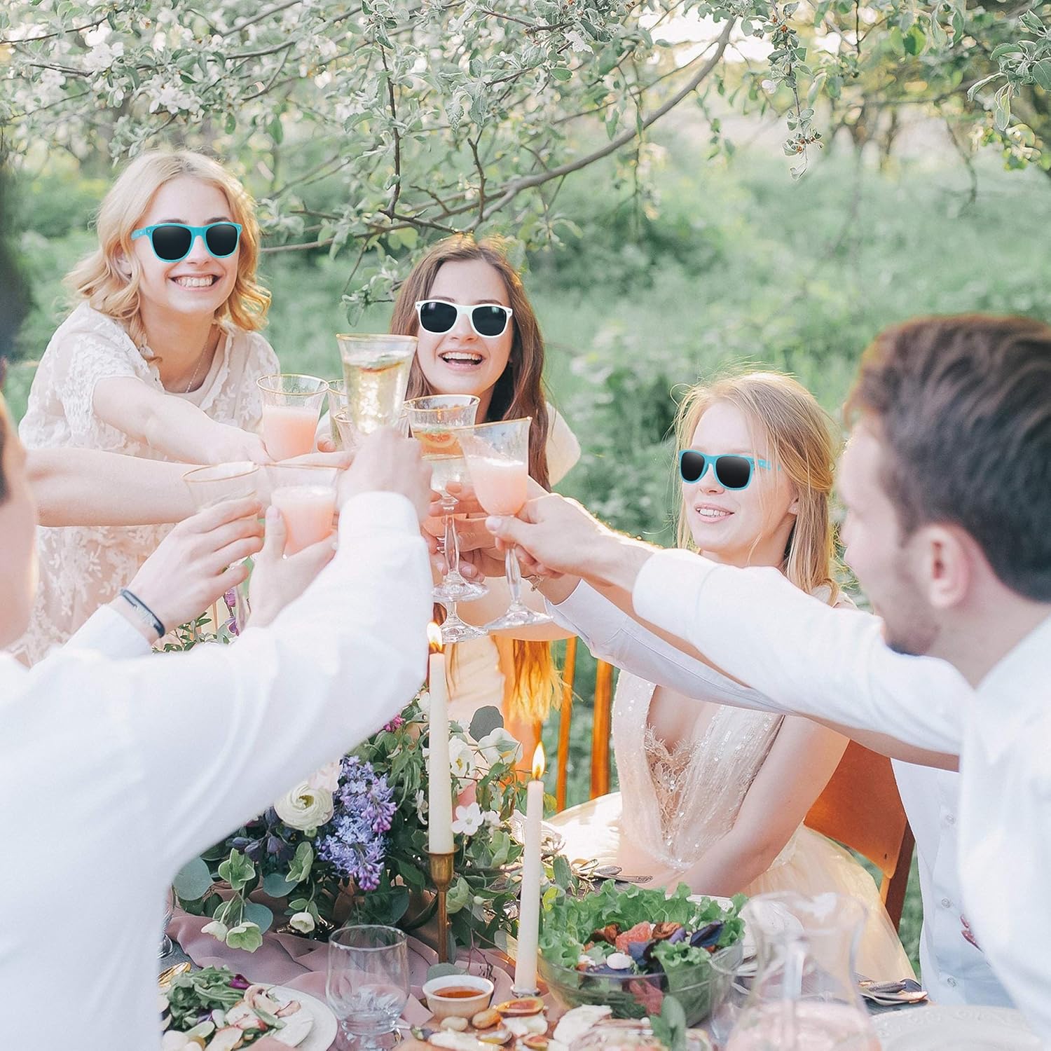 • UV 400 protection --- The retro style frame and mirrored lenses of the bachelorette sunglasses is a classic that you can't go wrong with. Comprised of durable polycarbonate frames and premium UV 400 protection lenses, the bridesmaid sunglasses protect you from harmful UVA and UVB sunlight.