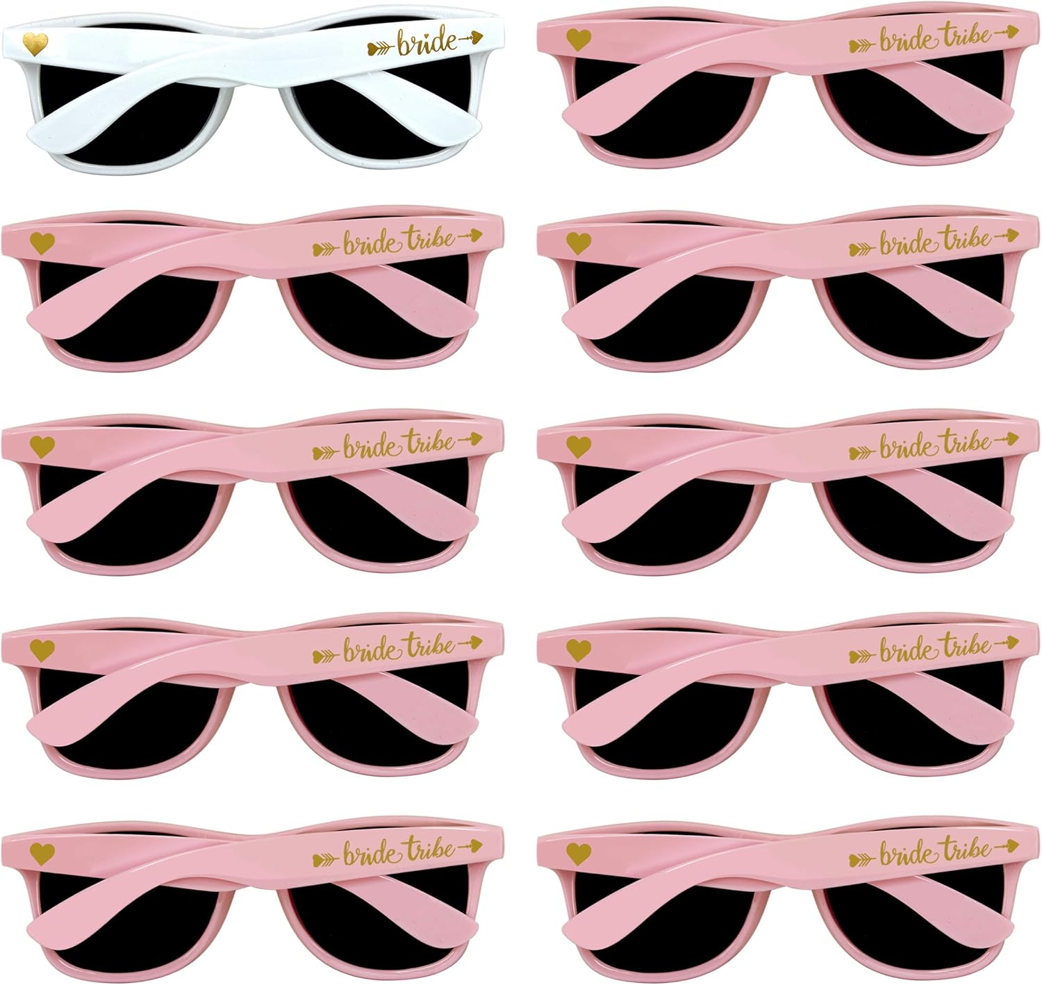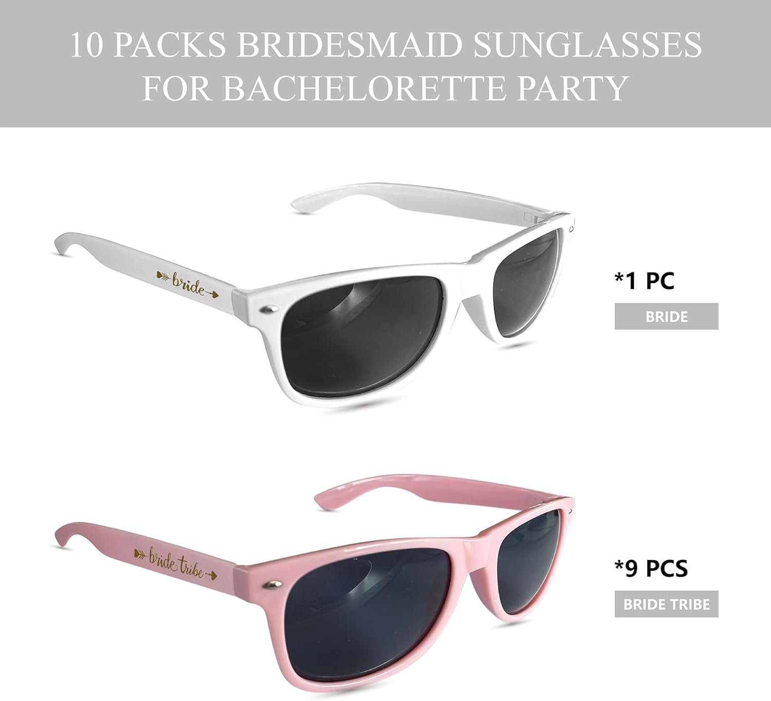 • Bachelorette Sunglasses Set---This Bachelorette Sunglasses kit contains a total of 1 Pair of white 'Bride' Sunglasses, 9 Pairs Pink 'Brides tribe' Sunglasses for bridesmaid. Great idea for Bachelorette party and bridal party.