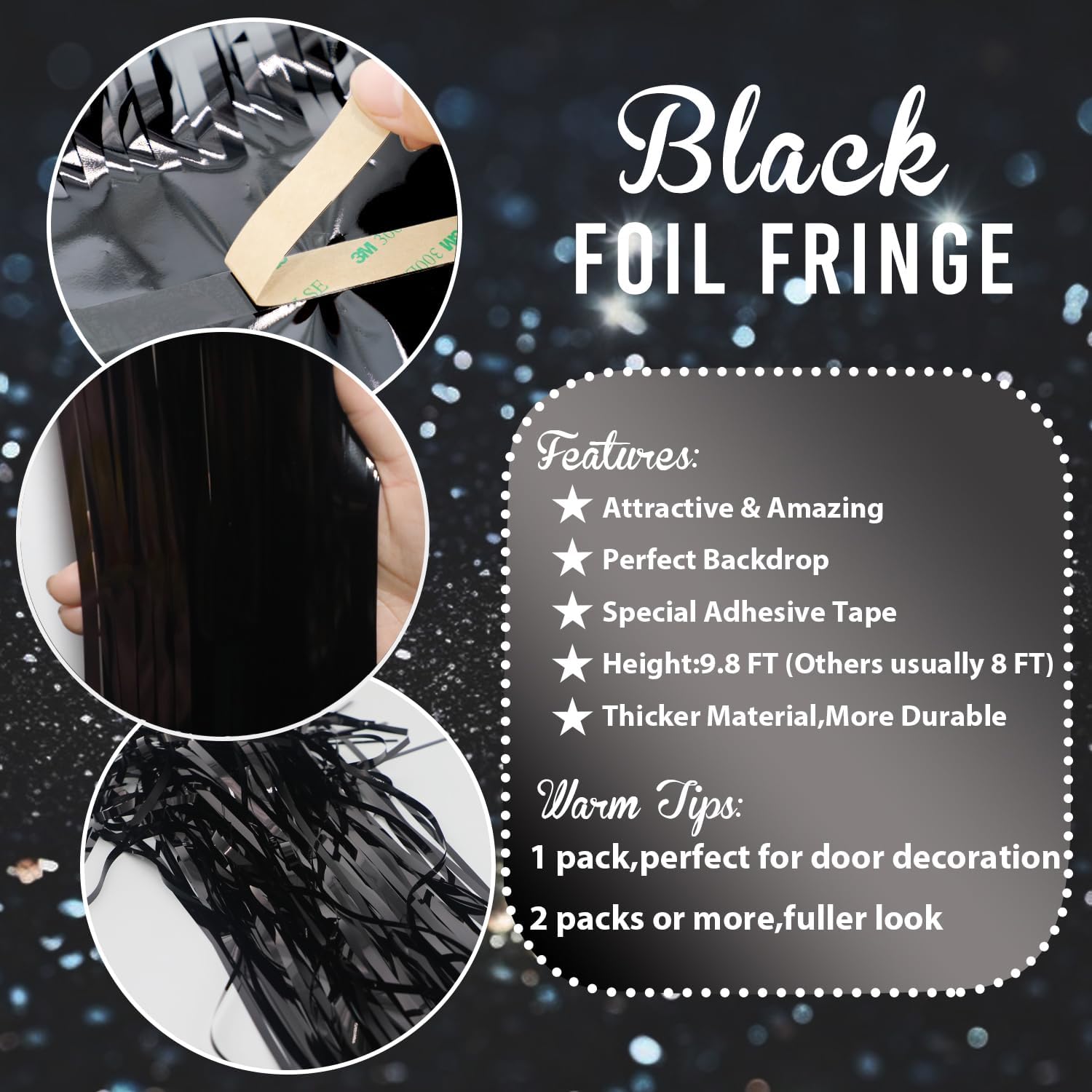 • Package Includes:2 pack black foil fringe curtains,3.2 ft x9.8 ft each,suitable for hanging on a door or coverage a wall fully