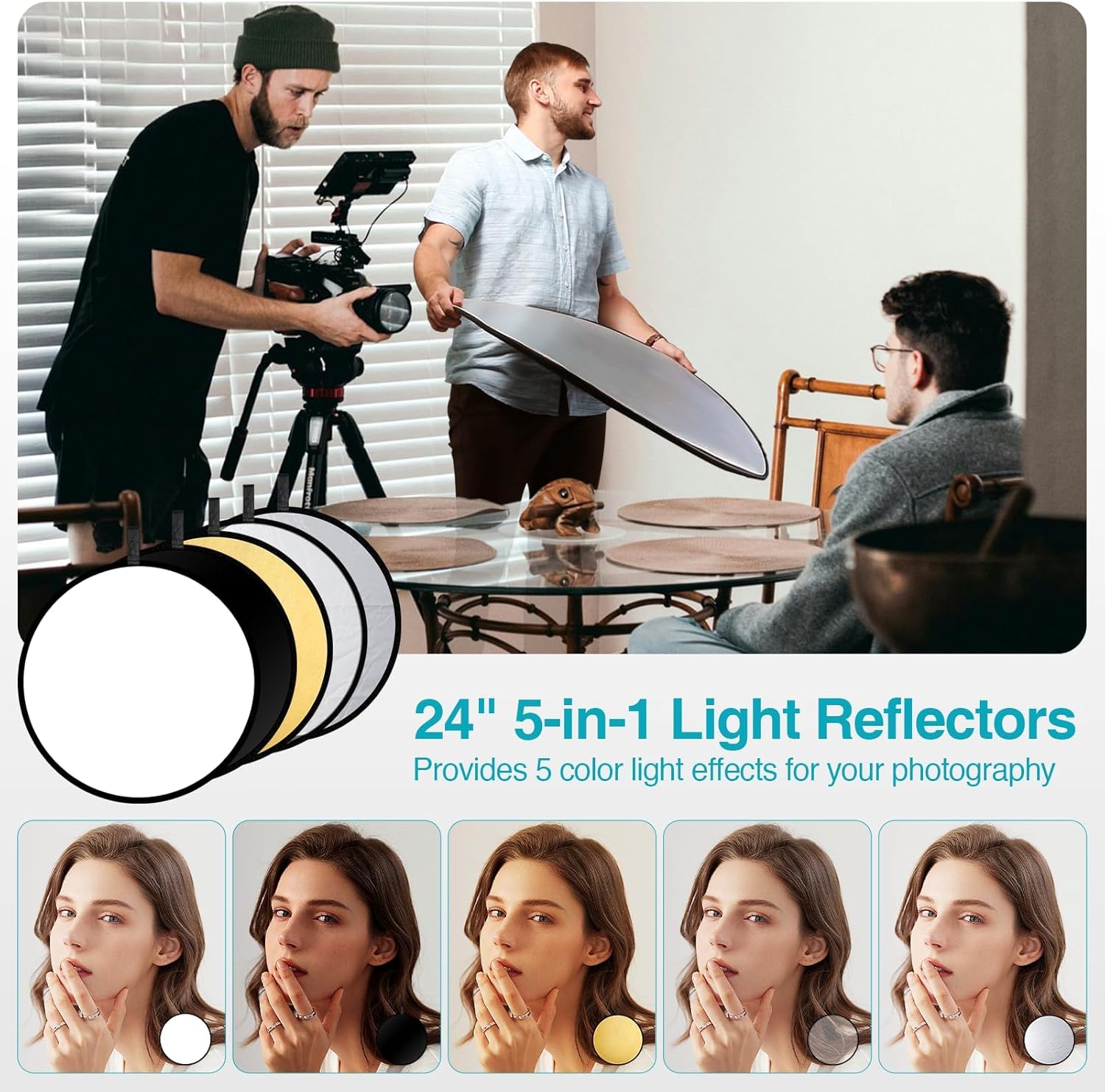 • Studio Light and Background Support System List, [2] 24"x24" Softbox, [1] 8.5 x 10ft Backdrop Stand Support System,[3] 6x9 ft Muslin Backdrop(Black, White and Green), [6]Backdrop Spring Clamps, [4] Backdrop Clip Holder, [4] 50W LED Bulb,[2]Lamp Holder, [2] 33inch Translucent Umbrella, [4] 7ft Light Stand, [1] 24" 5 in 1 Reflector. [1] Carrying Bag