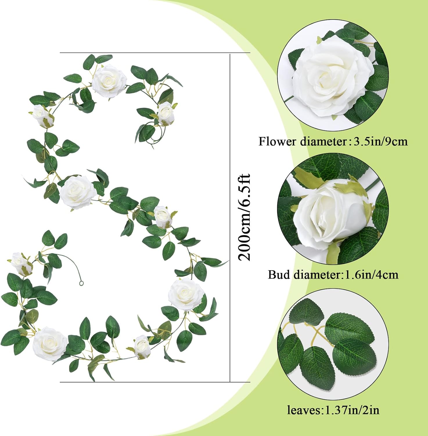 • Package Included: 3pcs White rose vine garlands. Each is about 6.5 feet long. Each garland has 4 rose blossoms, 5 buds and 102 leaves. Flower diameter: 3.5 Inch, Bud diameter: 1.6 Inch