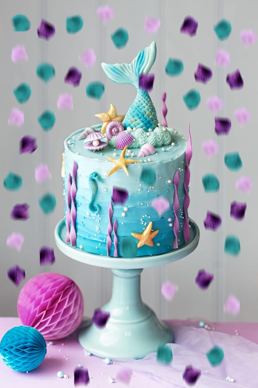 • Purple Lavender Teal mixture of artificial rose flower petals are just perfect color schemes for mermaid party supply, mermaid party decoration, girl baby shower, girl 1st birthday, bridal shower, under the sea party deocration.