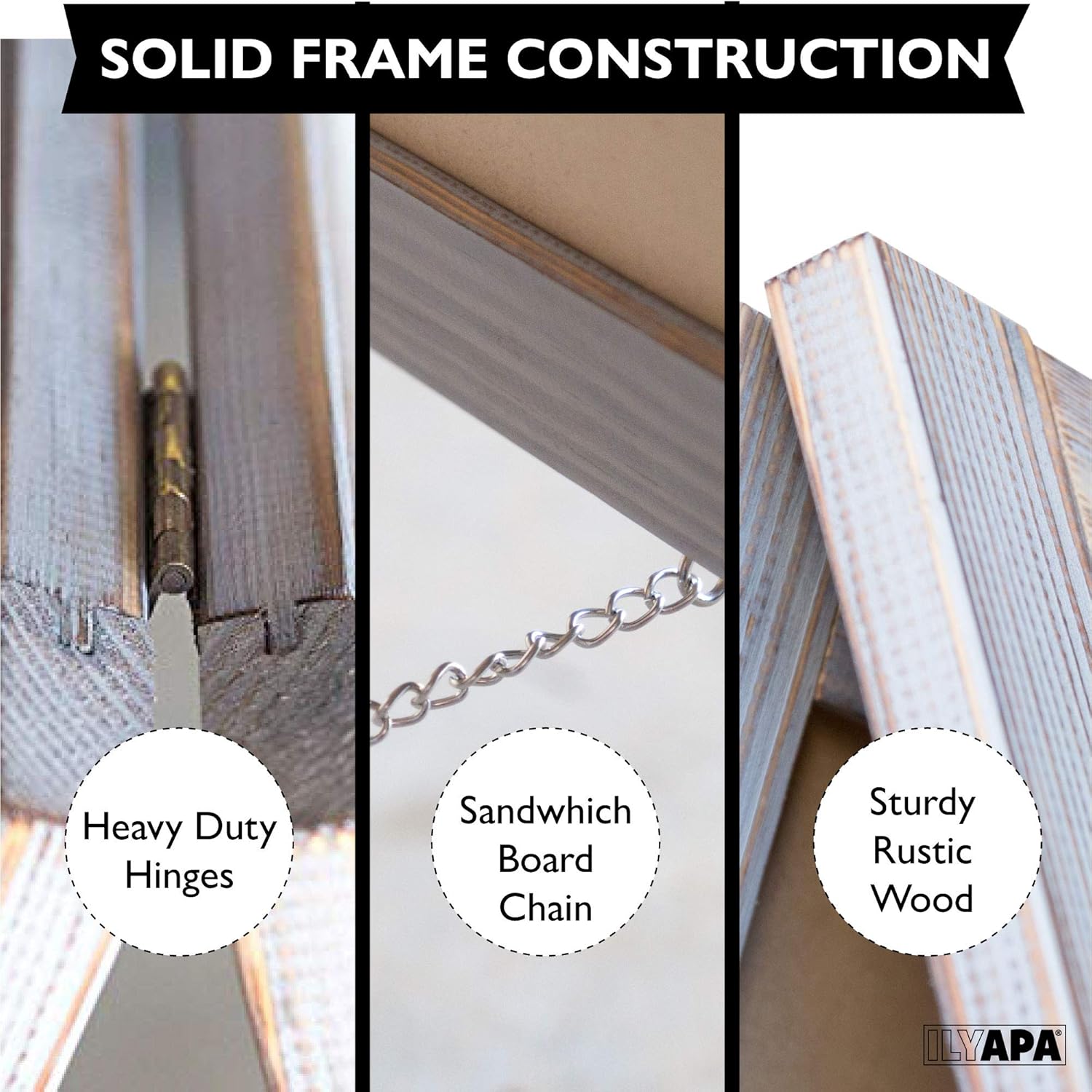 • Built To Last – With a heavy weight wooden frame, sturdy chalkboard surface, and durable design this sandwich board sign will withstand winds and last for years.