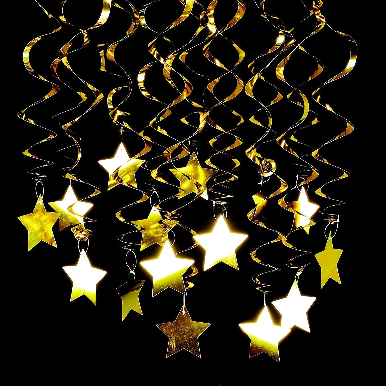 • PACKAGE INCLUDE: A total of 15 pcs hanging swirl decorations, including 15 gold double swirls and 15 swirls with PVC star. There are 15 strings in total, each of which is connected with a gold double swirls and a gold PVC star. Flexible swirls, hanging length can extend to approx 36"/91cm long.