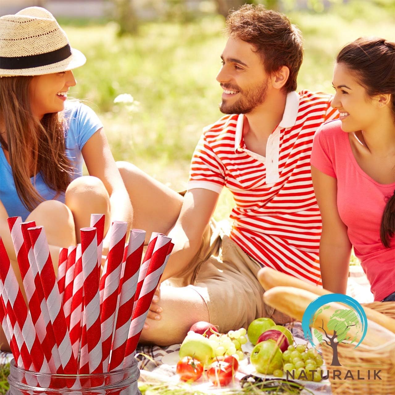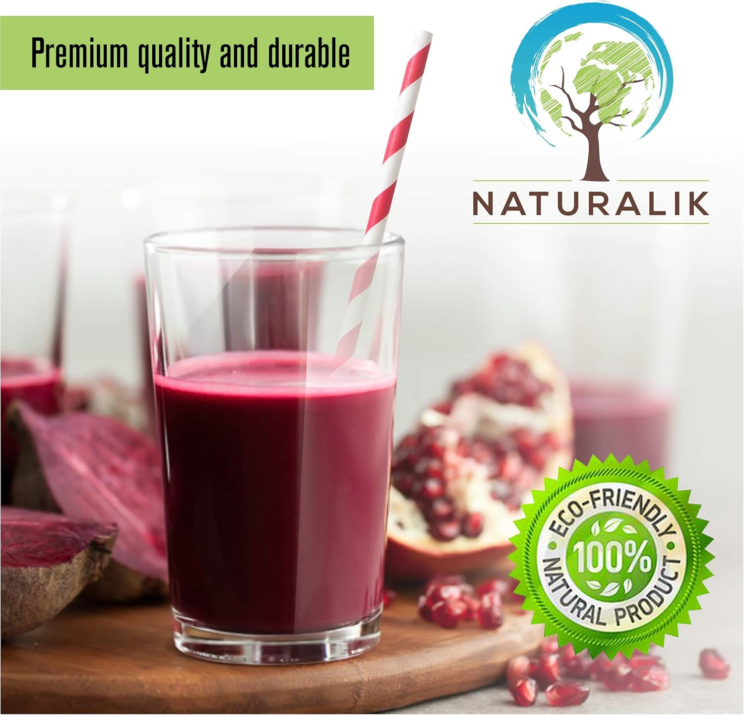 • NATURALIK 300pc Premium Red paper straws made with 1/3 more material than regular paper straws which makes them extra durable and sturdier. They are toxin free, taste and odor free. 7.75" long, 0.25" diameter. Bulk Paper Straws for Juices, Smoothies, Party Decorations and Restaurants.
