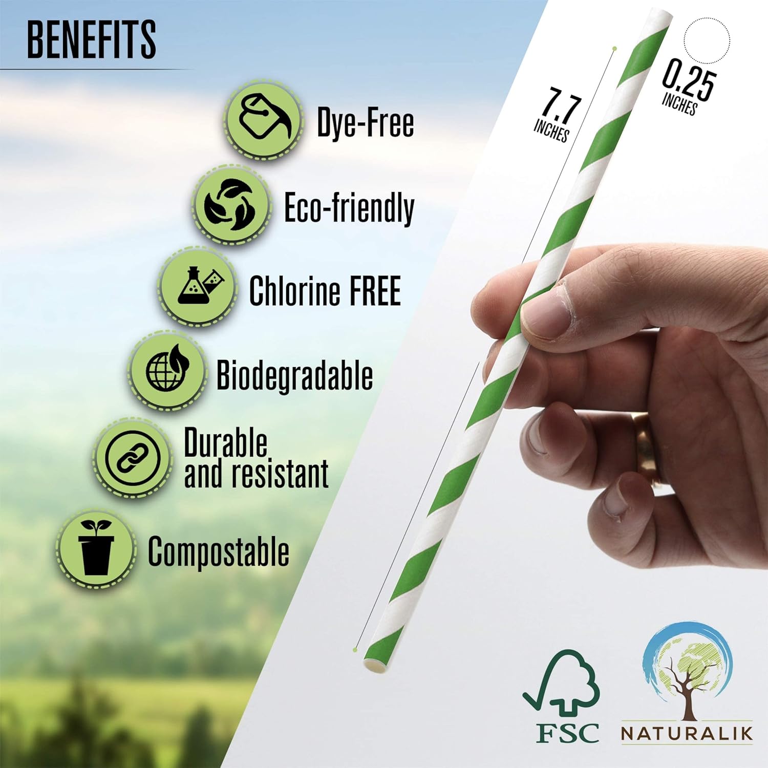 • NATURALIK 300pc Premium Multi-Color Paper Straws are made of extra durable materials that make them very sturdy and long lasting. They are toxin free, taste and odor free. The dimensions are 7.75" long.0.25" diameter. There are 10 colors included in each pack, 100pc of each color: Light Pink, Bright Pink, Light Blue, Navy Blue, Yellow paper, Orange, Purple, Lime, Green and Red paper straws.