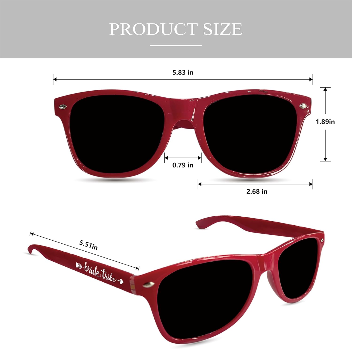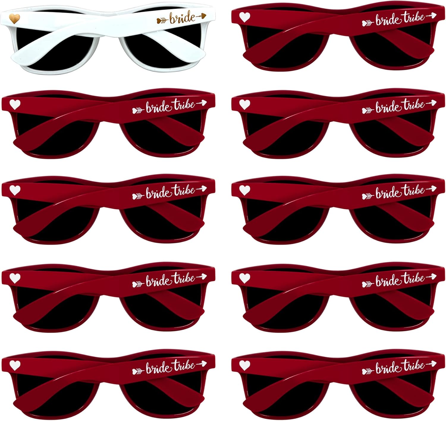 • Bachelorette Sunglasses Set---This Bachelorette Sunglasses kit contains a total of 1 Pair of white 'Bride' Sunglasses, 9 Pairs Red 'Brides tribe' Sunglasses for bridesmaid. Great idea for Bachelorette party and bridal party.