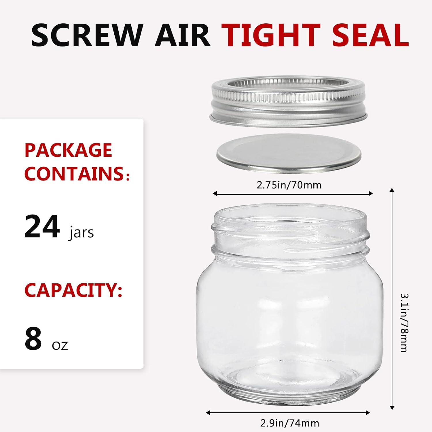 • Package include: 24 Pack 8oz/240ml mason jars with silver split-type screw metal lids; Size: 2.9 inch(Base Width) x 3.1 inch(Height) x 2.75 inch(Regular mouth)