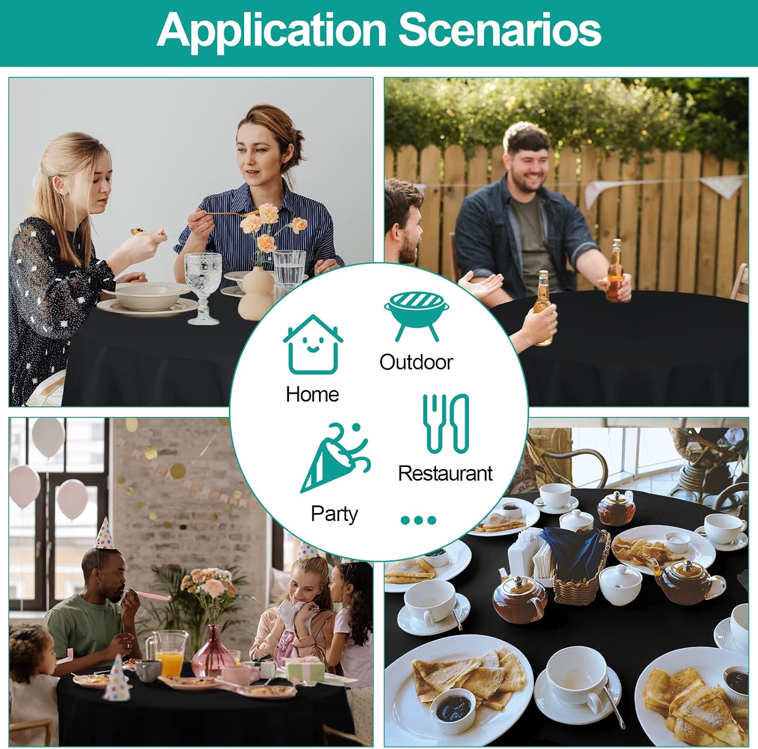 • 【Packing and Dimensions】Please measure the size of the table carefully before purchasing. You will get 1 pack black table cloth in one order. The table cloth is 120 inch in diameter. It will be packed and come in a transparent plastic bag