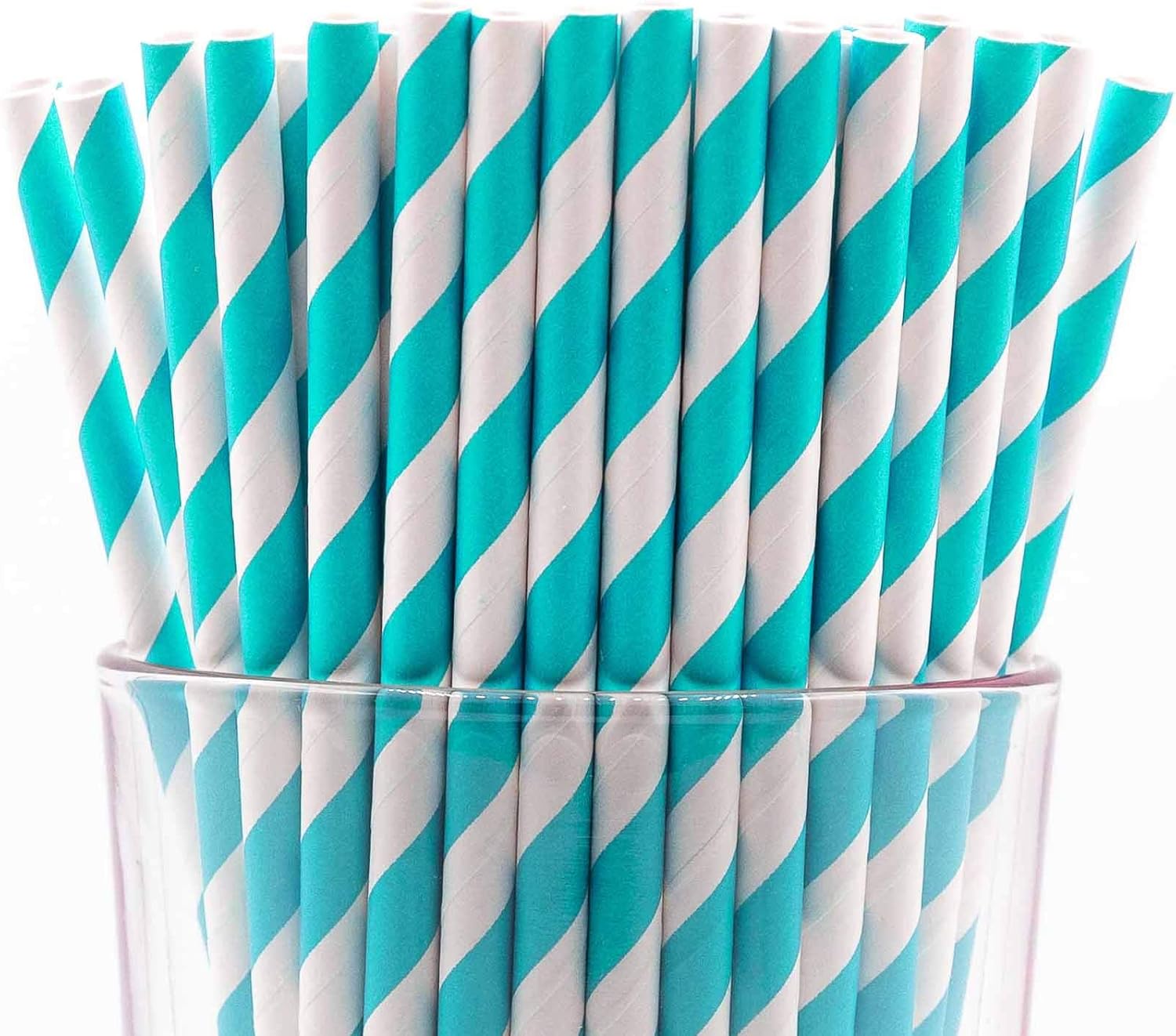 • Pack of 300 Turquoise Swirls paper straws that are 7.75” long and have a diameter of 0.25”. Made with 4-ply paper which translates into thicker and more resilient straws that won’t wilt or change shape in both hot and cold drinks.