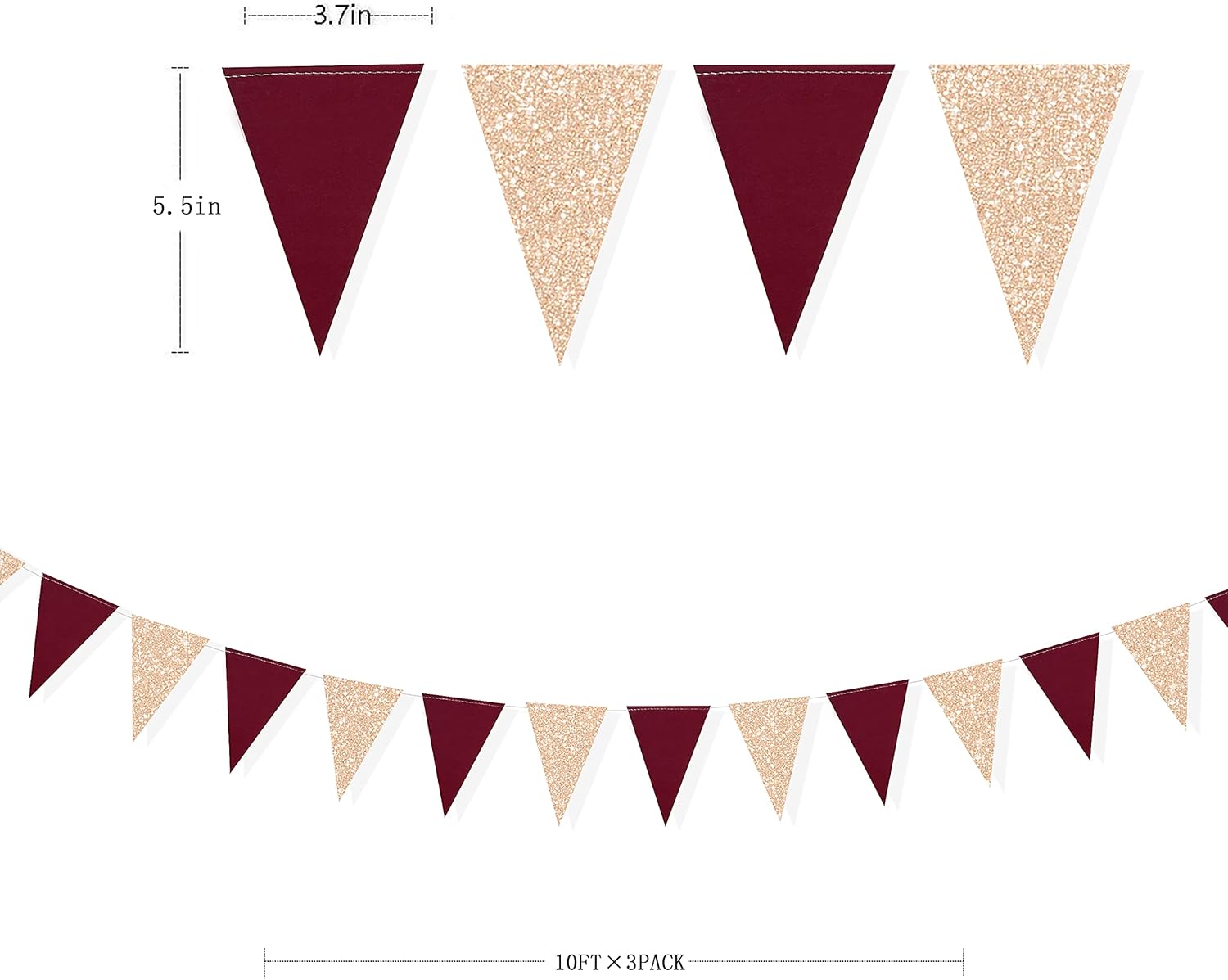 • Package Include - 3 set of double sided glitter champagne gold burgundy decorations hanging banner kit.each string is 3 meters with 26 pieces triangular flags,so total is 9 meters = 30 feet and 78 pieces flags. Size of each flag:14cm x 9cm/5.5" x 3.7" (L x W).