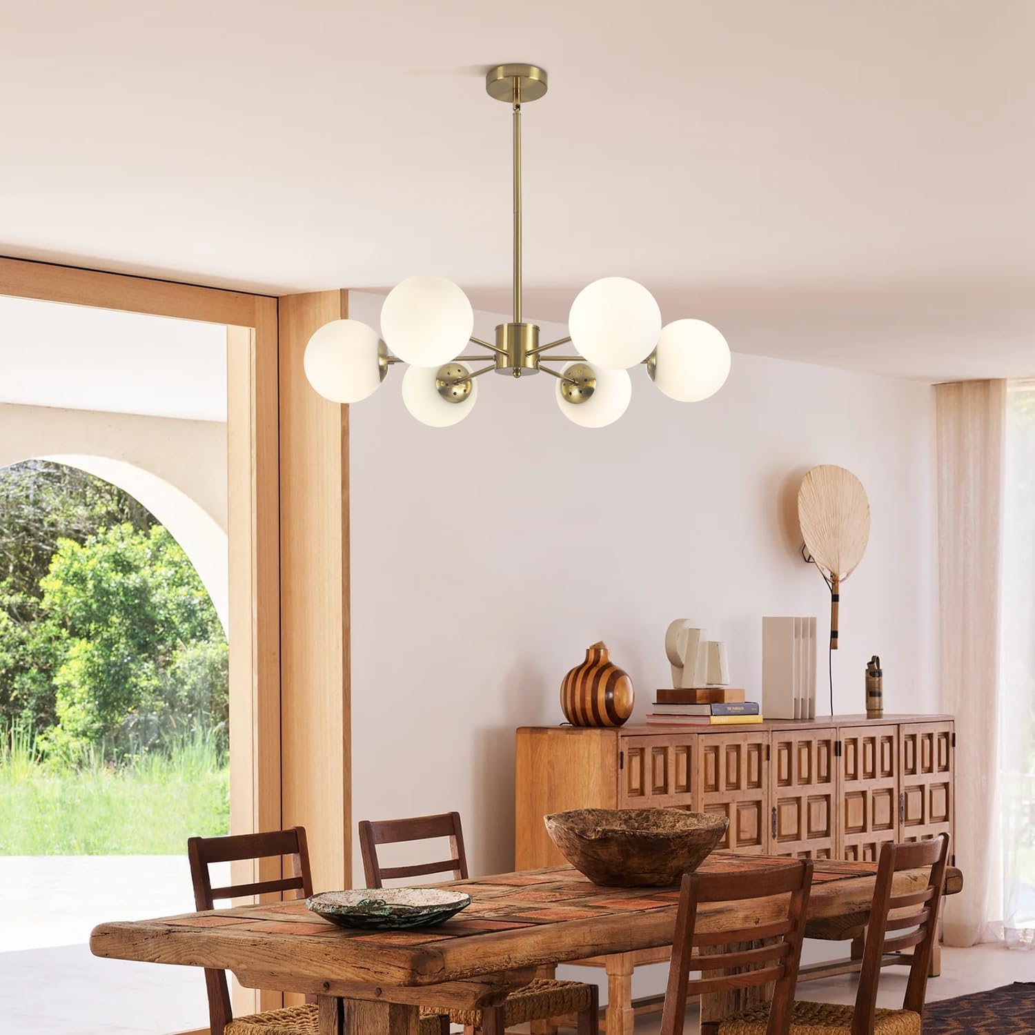 • Glass Sputnik Light: The globe dining room chandelier is designed with high quality metal and milk glass globe shade, six spherical lights extend from the central column in brass, adding an elegant and luxurious touch to your space