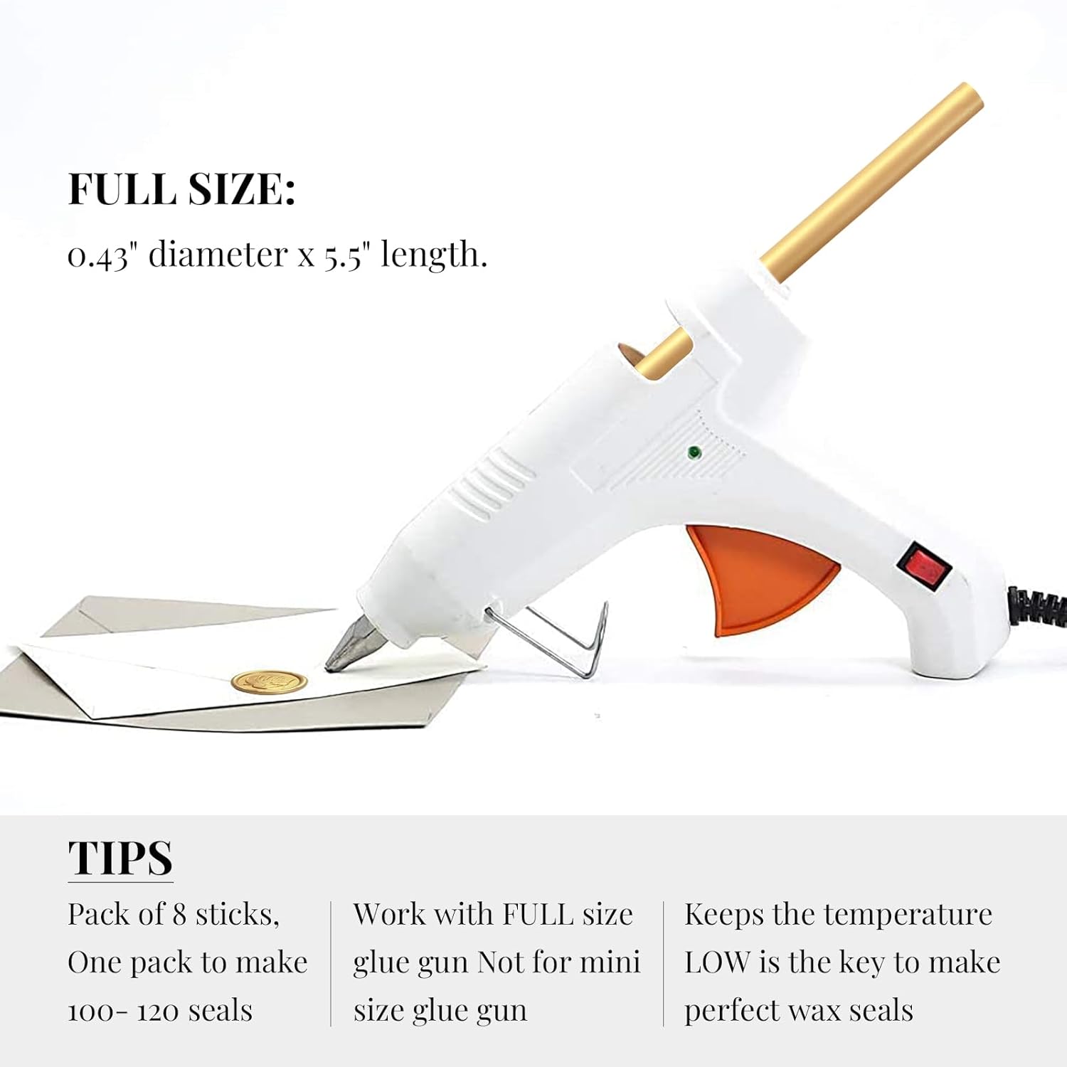 • Easy To Apply - Easily use together with a low-temp large standard 0.44" glue gun. Not designed for mini glue guns! If you plan to seal dozens of envelops, this is the most efficient method. To avoid the wax stuck to the stamp, you may put stamp on an ice pack in between every 4-5 impressions. Please remember the glue gun was designed for glue stick which requires a much higer melting temperature than the wax, so to keep the temperature low is the key.