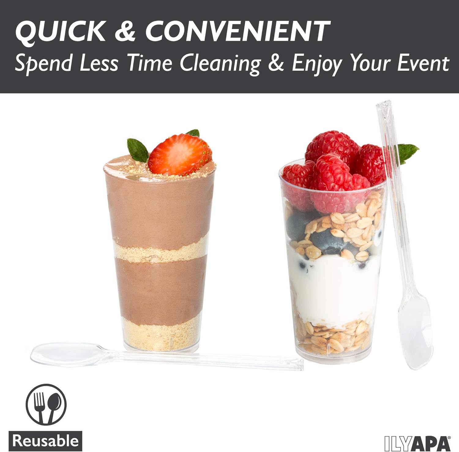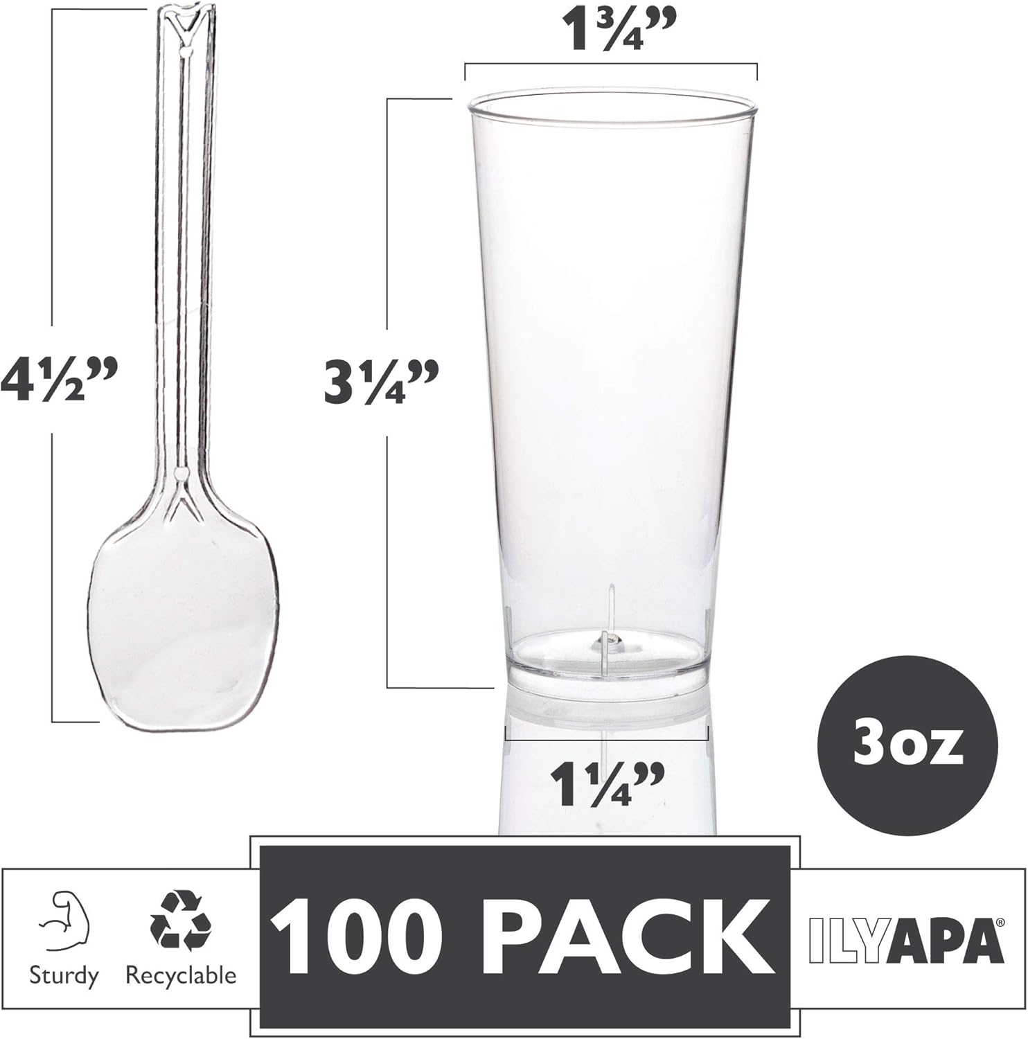 Ilyapa 3oz Plastic Dessert Cups - 100 Pack Mini Dessert Cups with Spoons - Clear Reusable Small Appetizer Cup for Cheesecake Shooters, Chocolate Mousse, Parfait - Party and Catering Supplies - Round