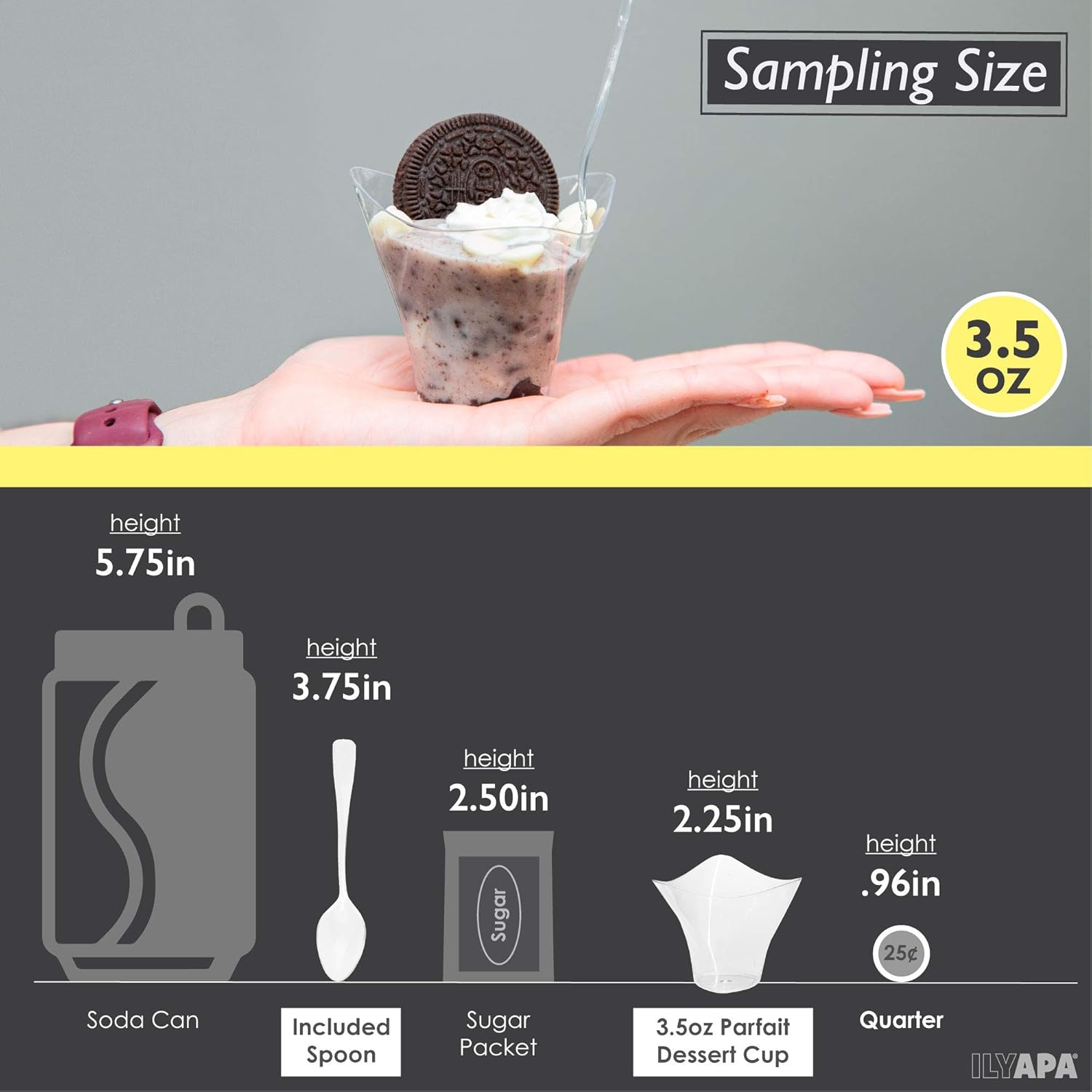 • Enhance any Occassion - With these stylish and premium dessert shooter cups! These 3.5oz parfait plastic serving cups come with 100 spoons, everything you need to serve 100 guests. These small desert cups are perfect for breakfast, brunch, appetizers, and more!