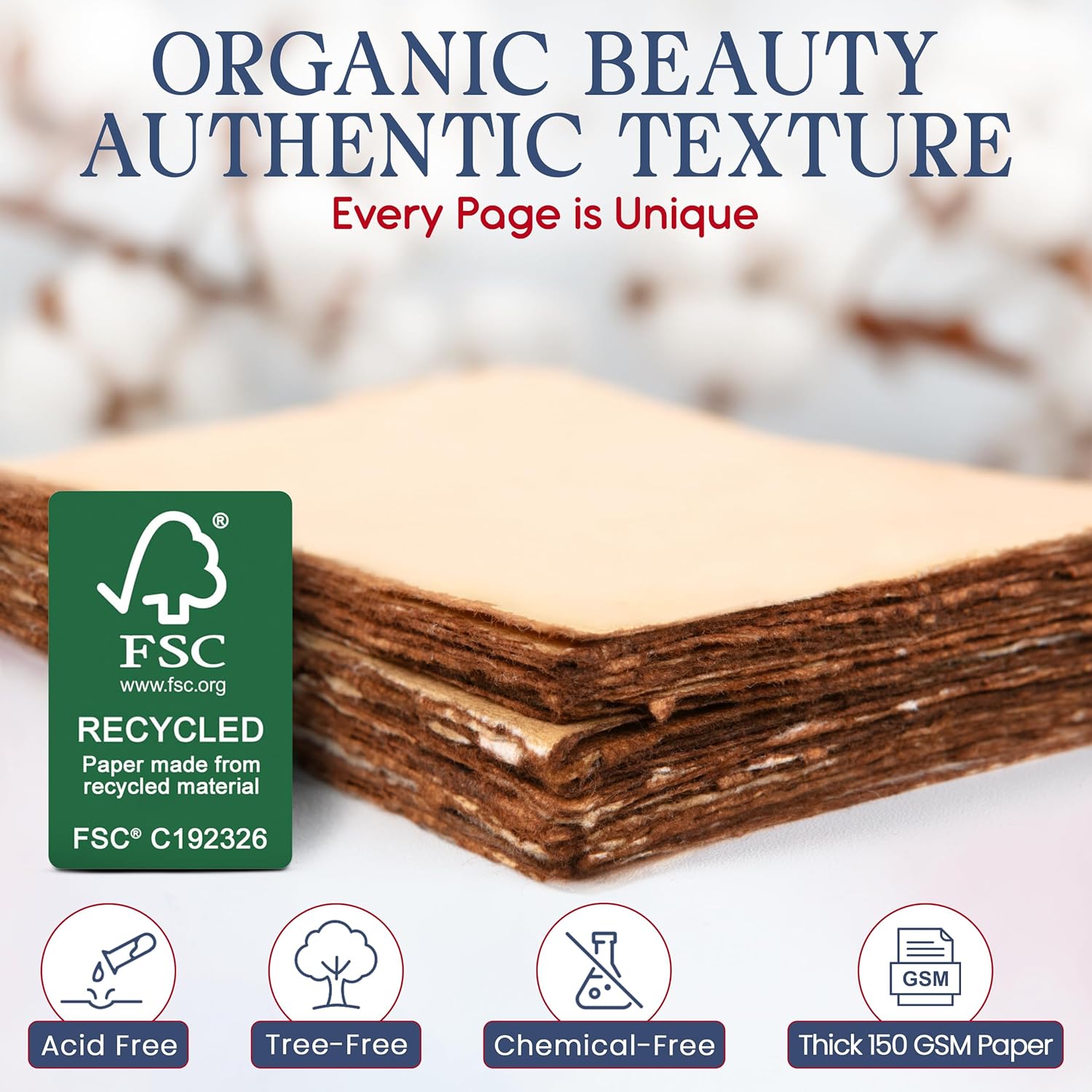 • Material : 100% recycled cotton rag fibers form the base of this eco-conscious handmade paper., 150 GSM cotton fiber paper, ideal for watercolor and fountain pen use., Artisans handcraft this paper from sun-dried cotton and natural fiber blends., Cotton-based paper with antique deckle edge crafted without chemicals or wood pulp., Crafted from acid-free cotton, ensuring durability and archival-quality preservation., Eco-friendly material includes cotton remnants upcycled from garment production., Hand-processed cotton pulp forms the foundation of this premium deckle edge paper., Handmade using raw cotton pulp, naturally dried under the sun., Made from long-fiber cotton for strength, texture, and minimal bleed-through., Natural cotton pulp is used to create a soft yet durable surface for writing and art., Natural materials like cotton and water combine in small-batch artisan production., Pure cotton base enhances ink absorption and supports multiple artistic media., Sustainably sourced cotton rags are transformed into thick, textured art paper., Tree-free cotton paper made from textile waste using traditional Indian methods. 100% recycled cotton rag fibers form the base of this eco-conscious handmade paper., 150 GSM cotton fiber paper, ideal for watercolor and foun… See more
