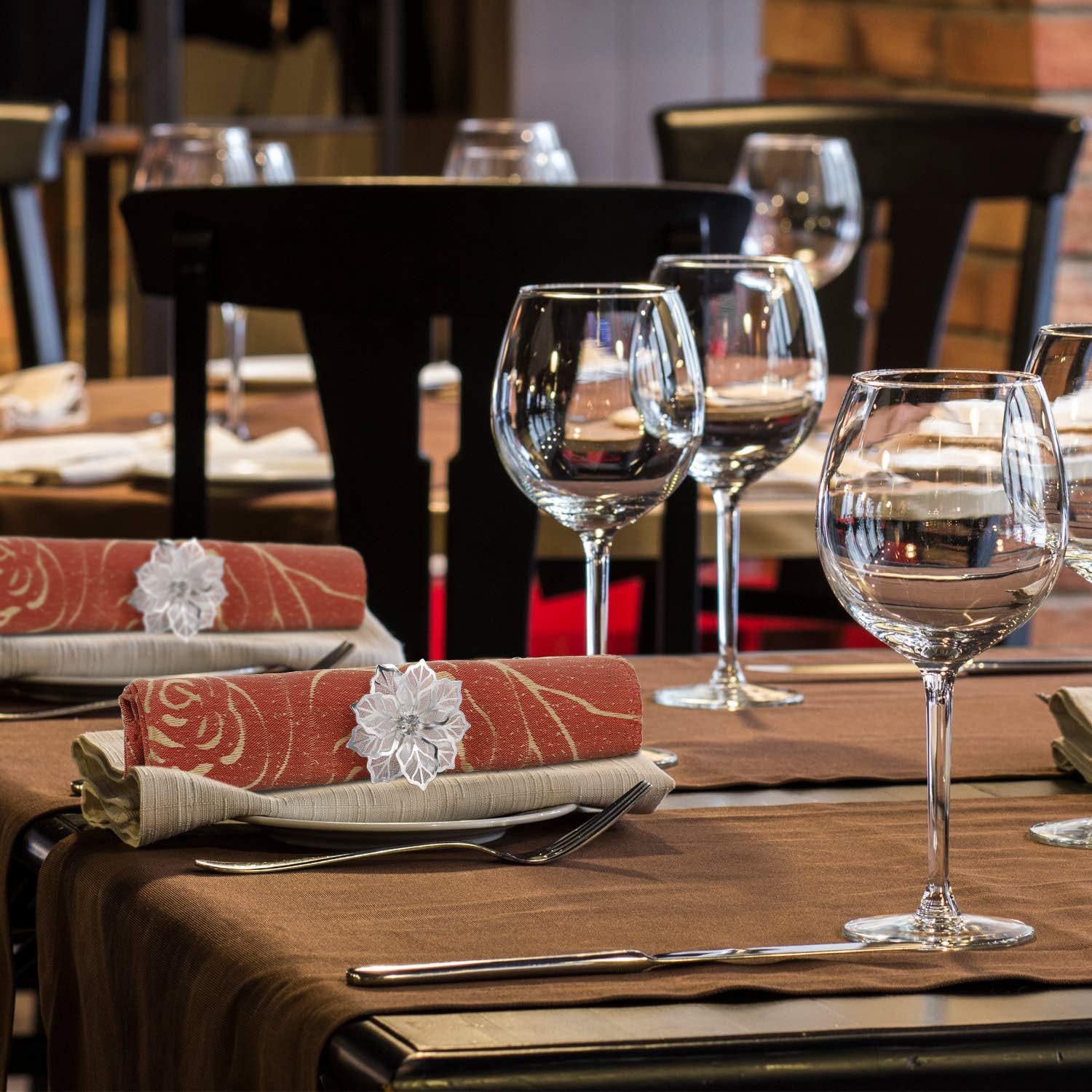 • Glittering appearance: the diameter of napkin ring holder is 1.69 inches and the flower is about 1.96 inches, the faux rhinestones will shine brilliantly in the light, beautiful design brings elegance to your table, and makes your food look more delicious
