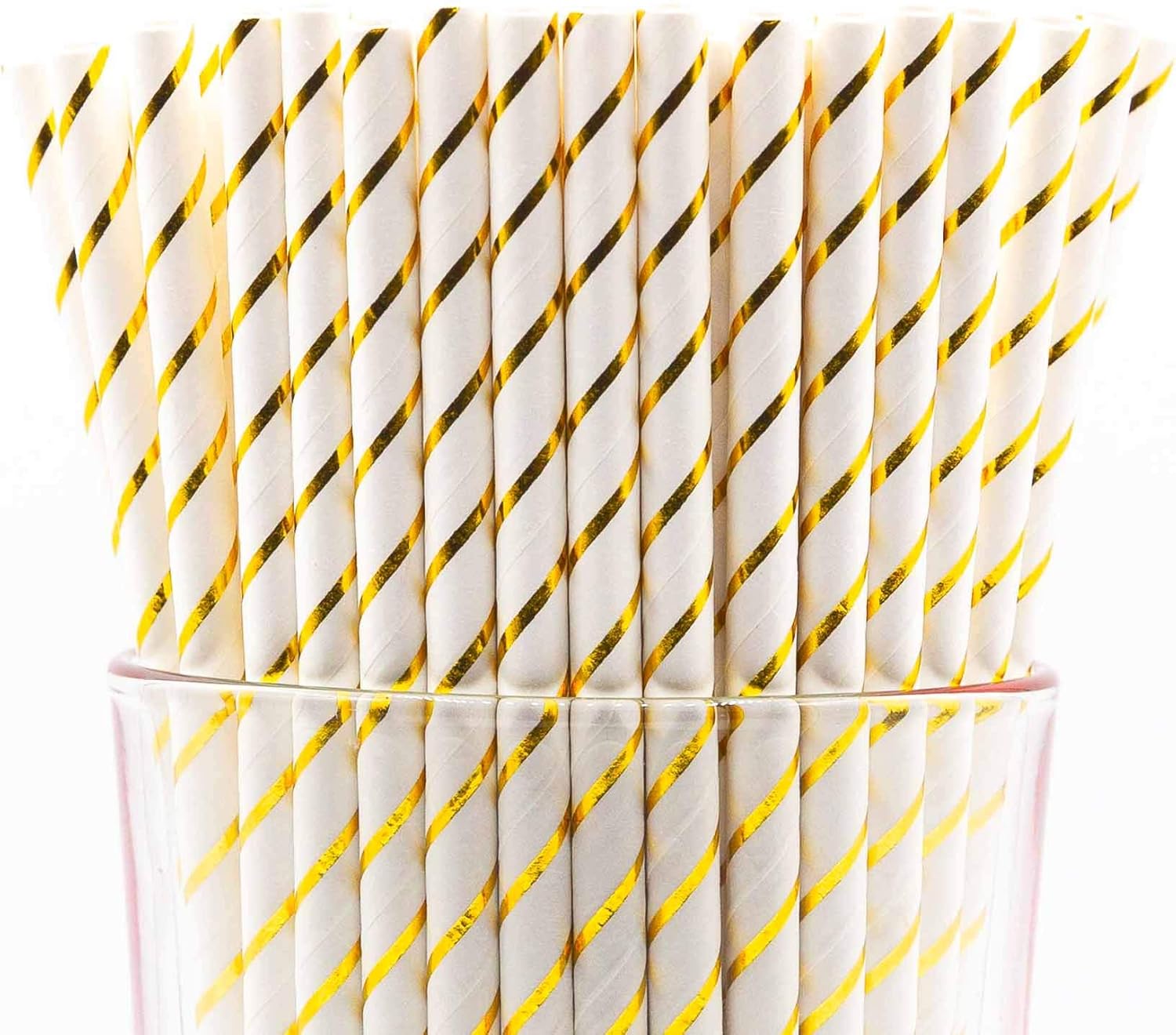 Pack of 150 Gold Foil Stripes Biodegradable 4-Ply Paper Drinking Straws (Compostable, Non-toxic, BPA-free)