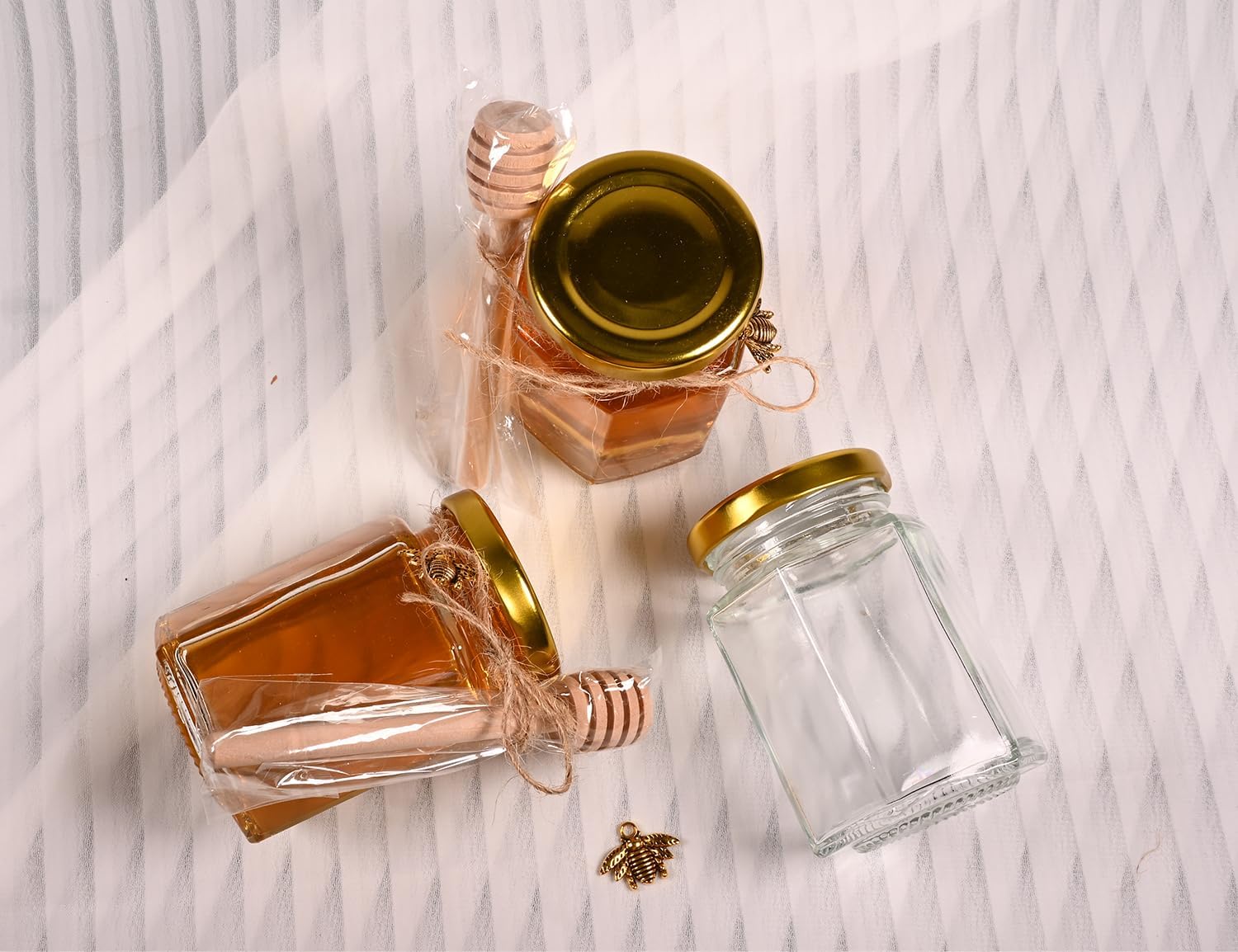 Adabocute 4oz Hexagonal Honey Jars - Glass Honey Jars with Gold Lids, Wooden Dippers, Bee Charms and Jutes - Hexagon Jars for Baby Shower, Wedding and Party Favors, 12 Pack