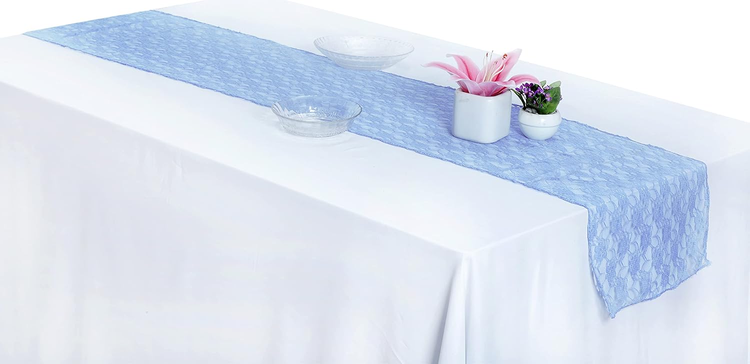MDS Pack of 25 Wedding 12 x 108 inches Lace Table Runner for Wedding, Decorations for Birthday Parties, Banquets, Graduations, Engagements, and Runners fit Rectangle, Round Table- Baby Blue