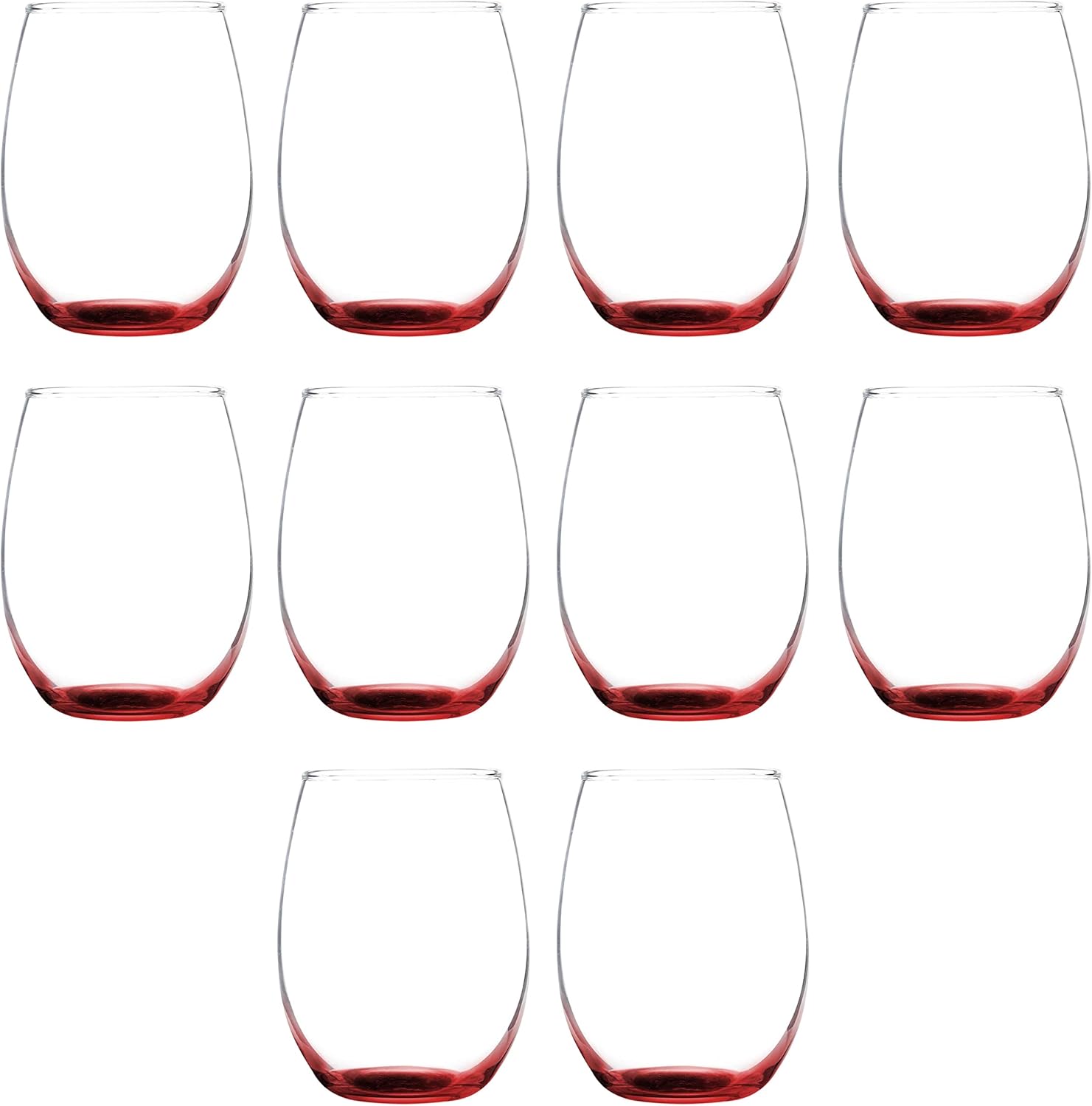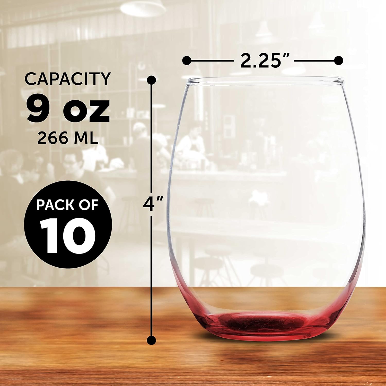 DISCOUNT PROMOS Stemless Wine Glass 9 oz. Set of 10, Bulk Pack - Great for Wedding Favors, Bachelorette Party and More - Red Bottom Color
