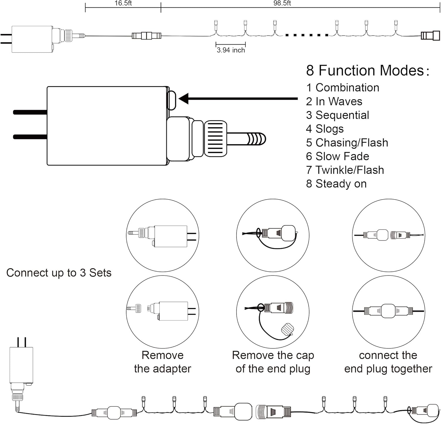• 30V low voltage black wire string lights: Keep at a low temperature state after lighting up for hours, ensure and maximize the safety. Directly plug in and unplug it for power on and off. US standard outlet, voltage 110V. Adapter to the first LED light: 16.5ft. Total length(lights string and leading line): 115ft.
