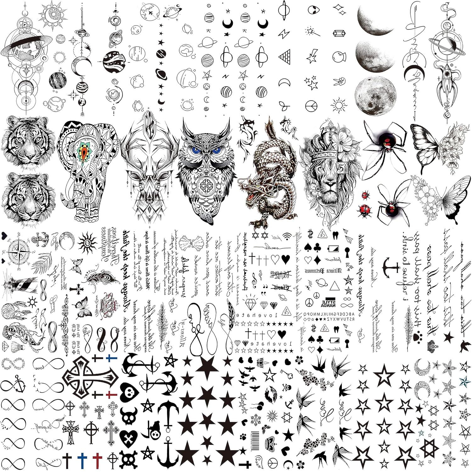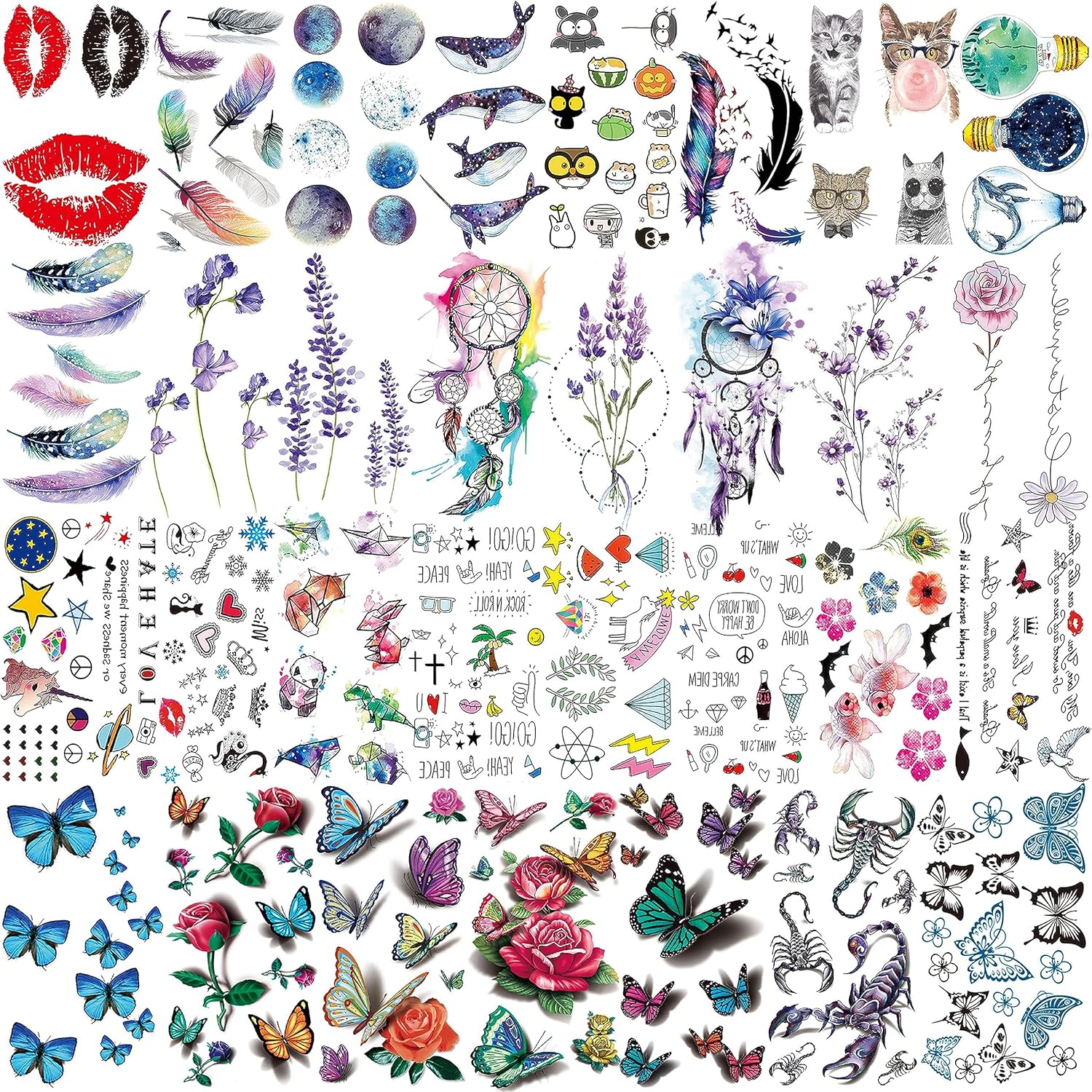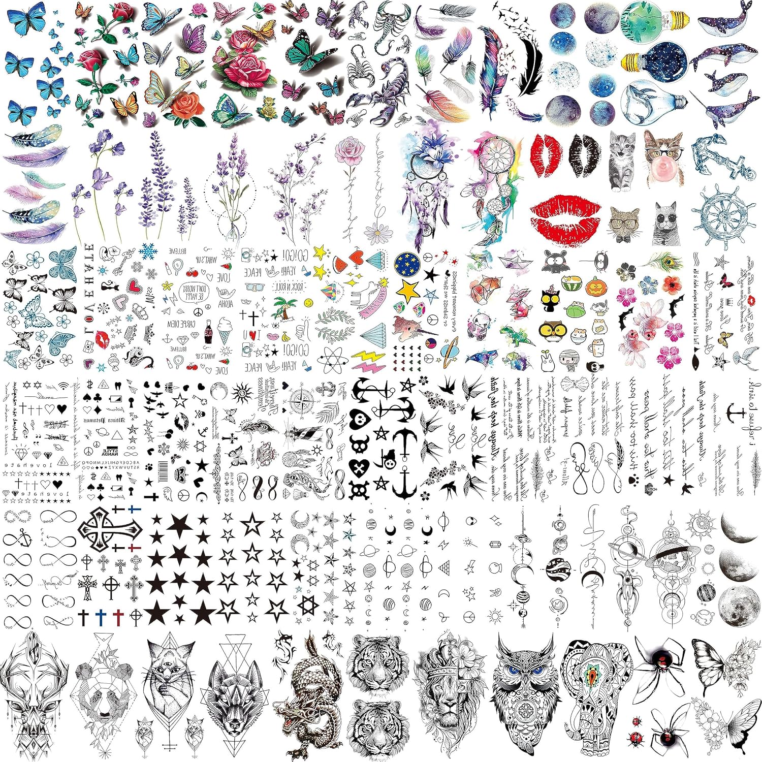 • 🍷66 Sheets 430+ PCS Cute Temporary Tattoos Sticker Fashion Designs🍸 EGMBGM Brand Original 3D Multicolor Animals Unicorn Flower Rose Butterfly Dragon Wolf Owl Deer Elk Tiger Lion Dreamcatcher Whale Feather Lips Birds Outer Space Planets Star Tattos Moon Sun Heart Crown Goldfish Anchor Gothic Pirate Inspirational Words Quotes Scorpion infinity Cross Funny Panda Cat Spider Temporary Tattoos For Women. There Are 66 Sheets 10.5x6CM 4.1"x2.3" Fun Small Temporary Tattoos For Adults In Each Package.