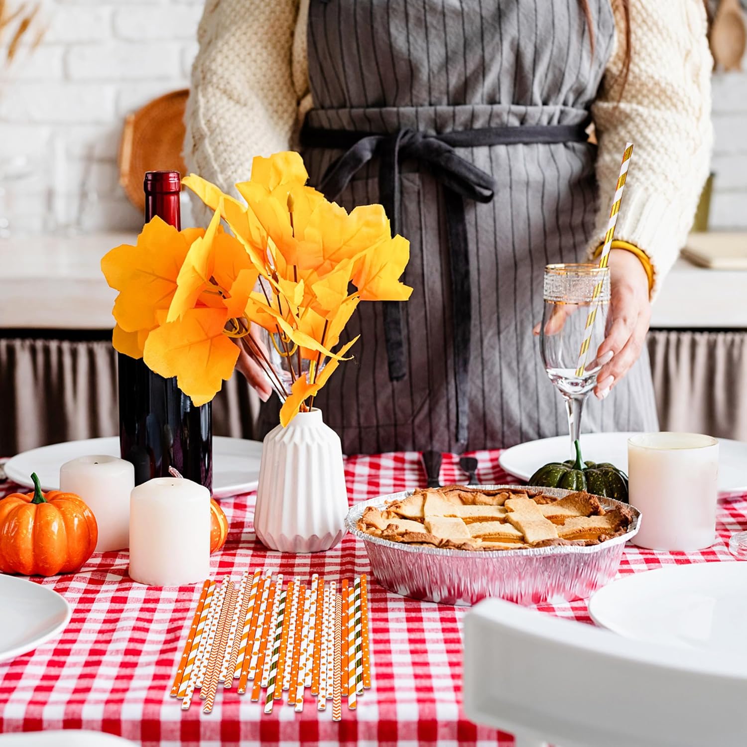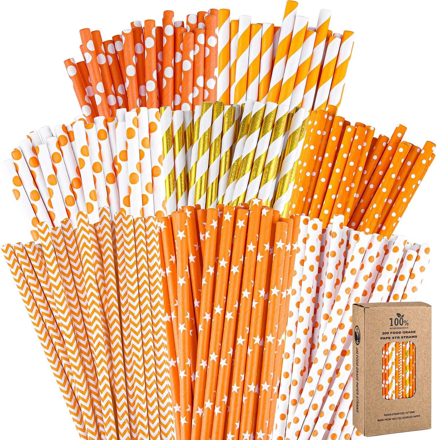 Cooraby 200 Pieces Thanksgiving Paper Straws Orange and Gold Assorted Paper Straws Biodegradable Drinking Straw Mix for Fall Leaf Autumn Wedding Supplies, 8 Style