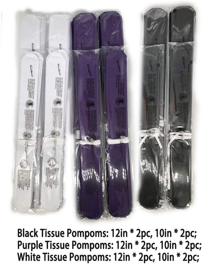 • TISSUE PAPER FLOWER BLACK PURPLE AND WHITE 12pc in 2 sizes,package include black crafts flower 4pc (2pc in 12'' and 2pc in 10''), purple crafts flower 4pc(2pc in 12'' and 2pc in 10''), white crafts flower 4pc(2pc in 12'' and 2pc in 10'')